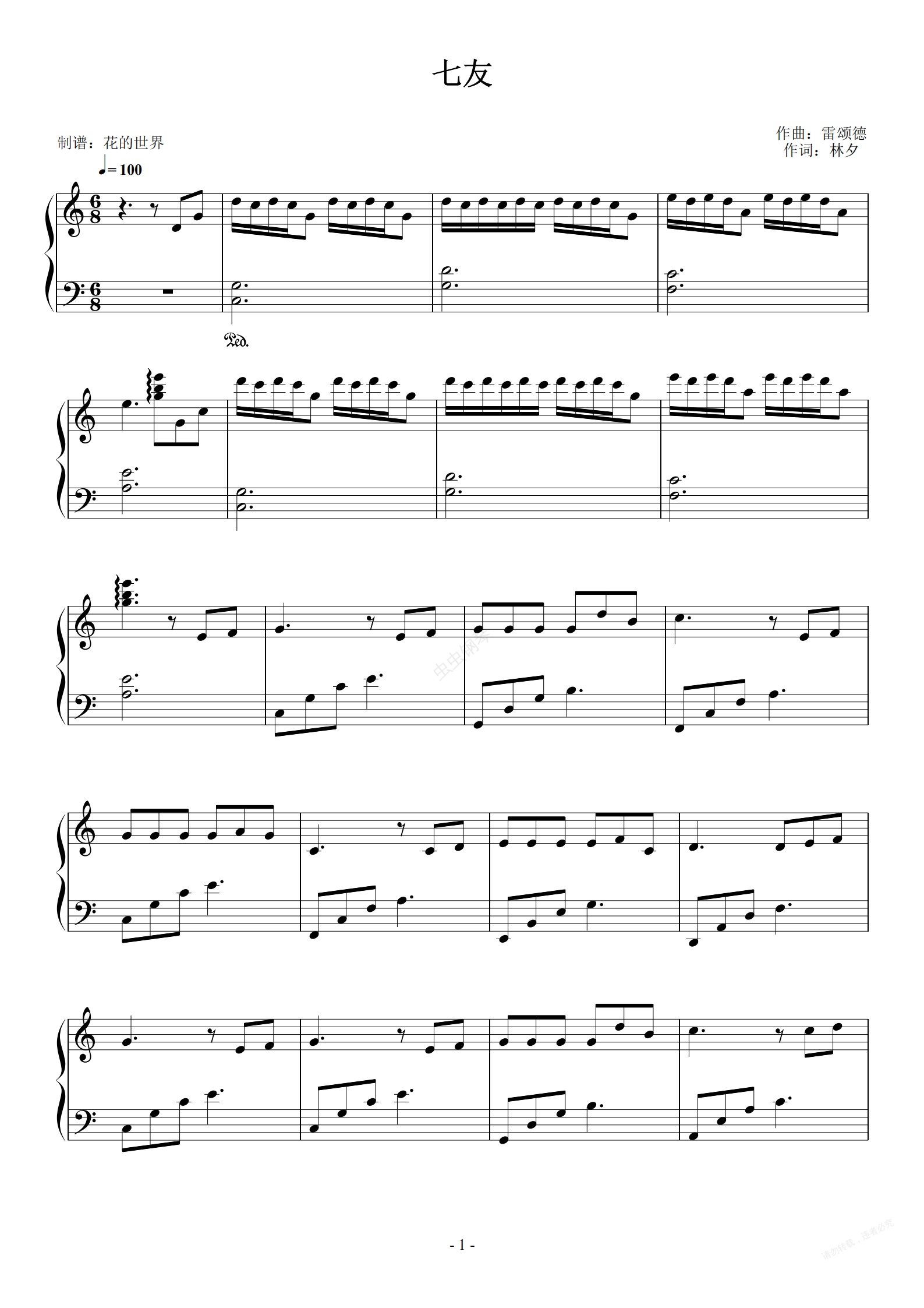 钢琴谱:七友 C调简易版 梁汉文