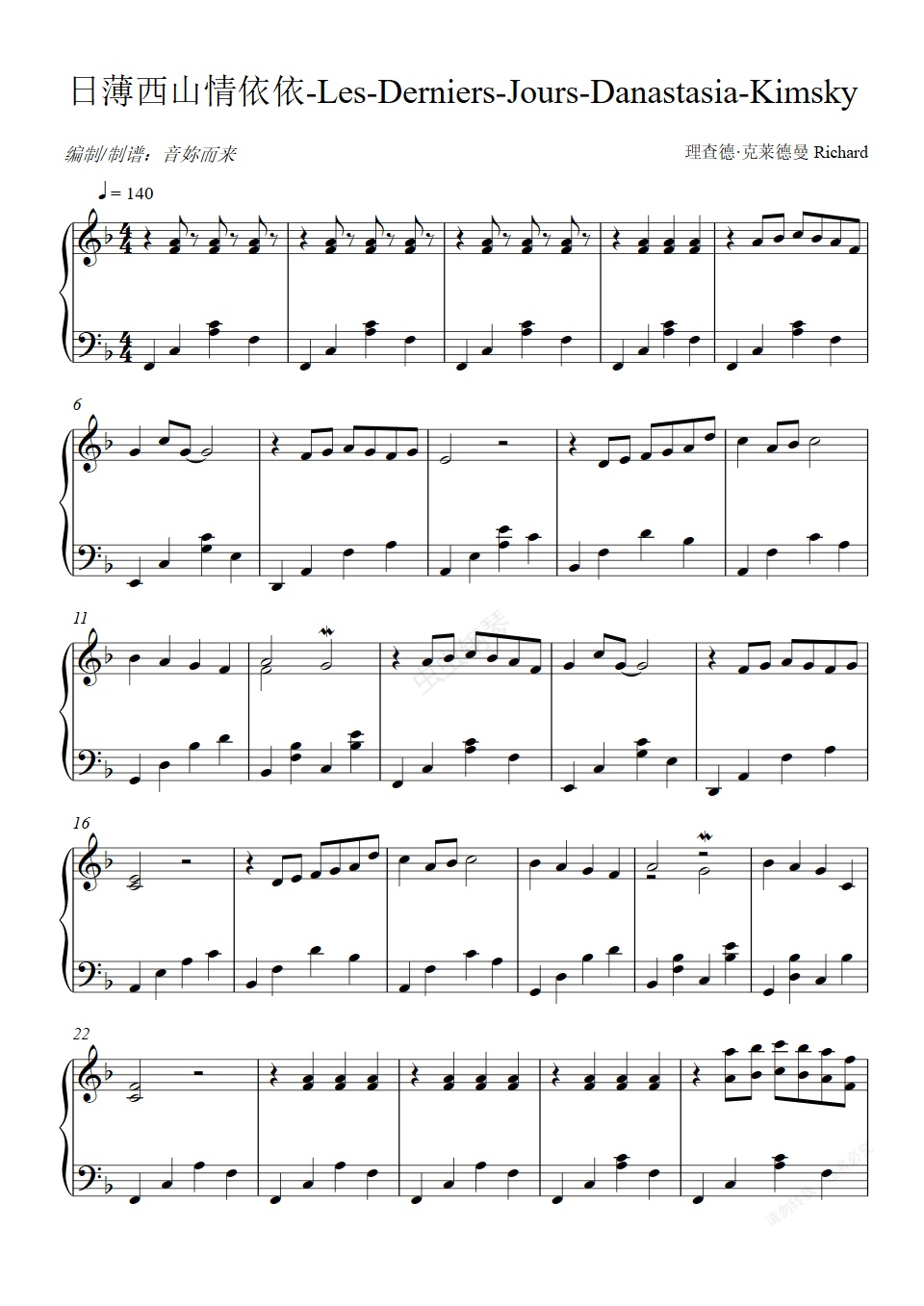 钢琴谱:理查德·克莱德曼 - 日薄西山情依依 【好听的纯音乐】