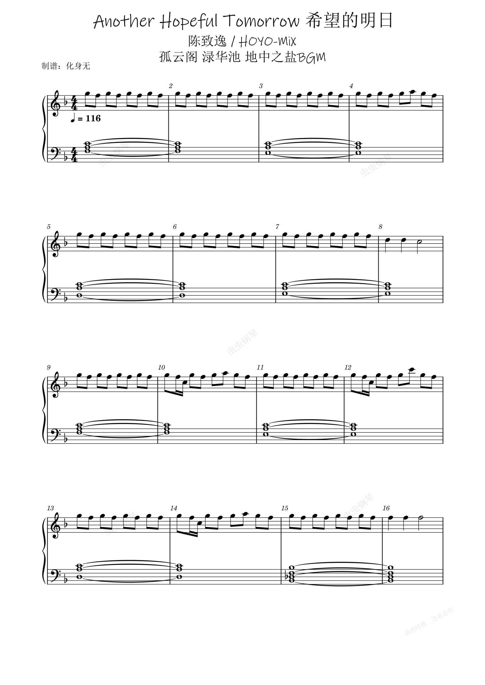 钢琴谱:原神璃月孤云阁 渌华池 地中之盐BGM 希望的明日  Another Hopeful Tomorrow