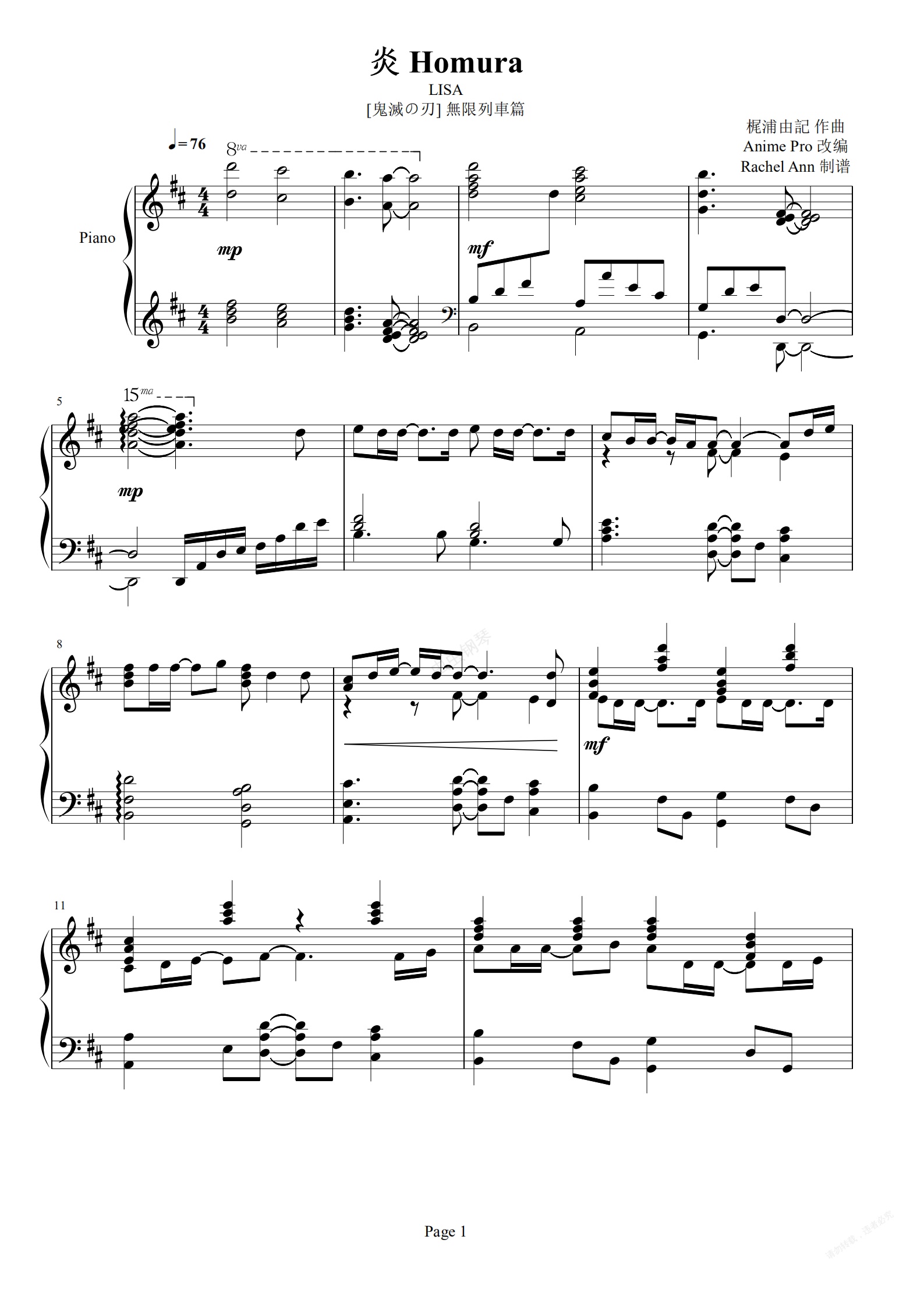 钢琴谱:LISA炎Homura《鬼灭之刃》剧场版无限列车篇主题曲 外国网友改编演奏的超华丽版