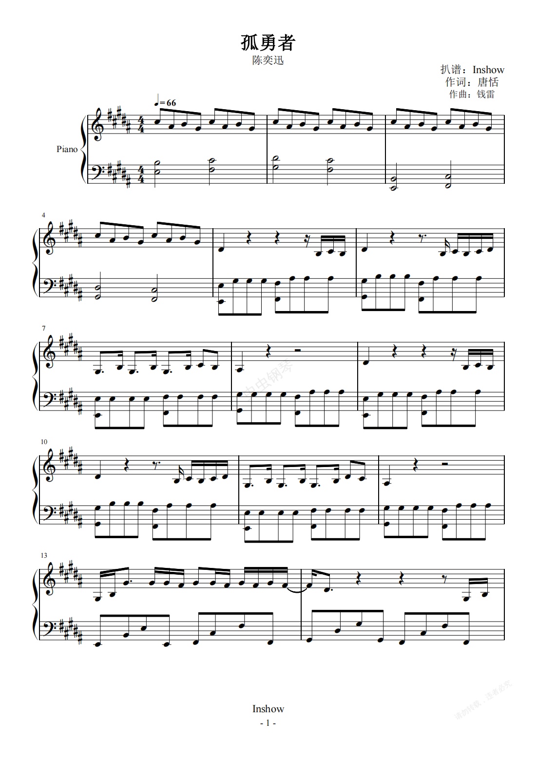 钢琴谱:孤勇者【原调独奏】- 陈奕迅 -(动画《英雄联盟:双城之战》中文主题曲)