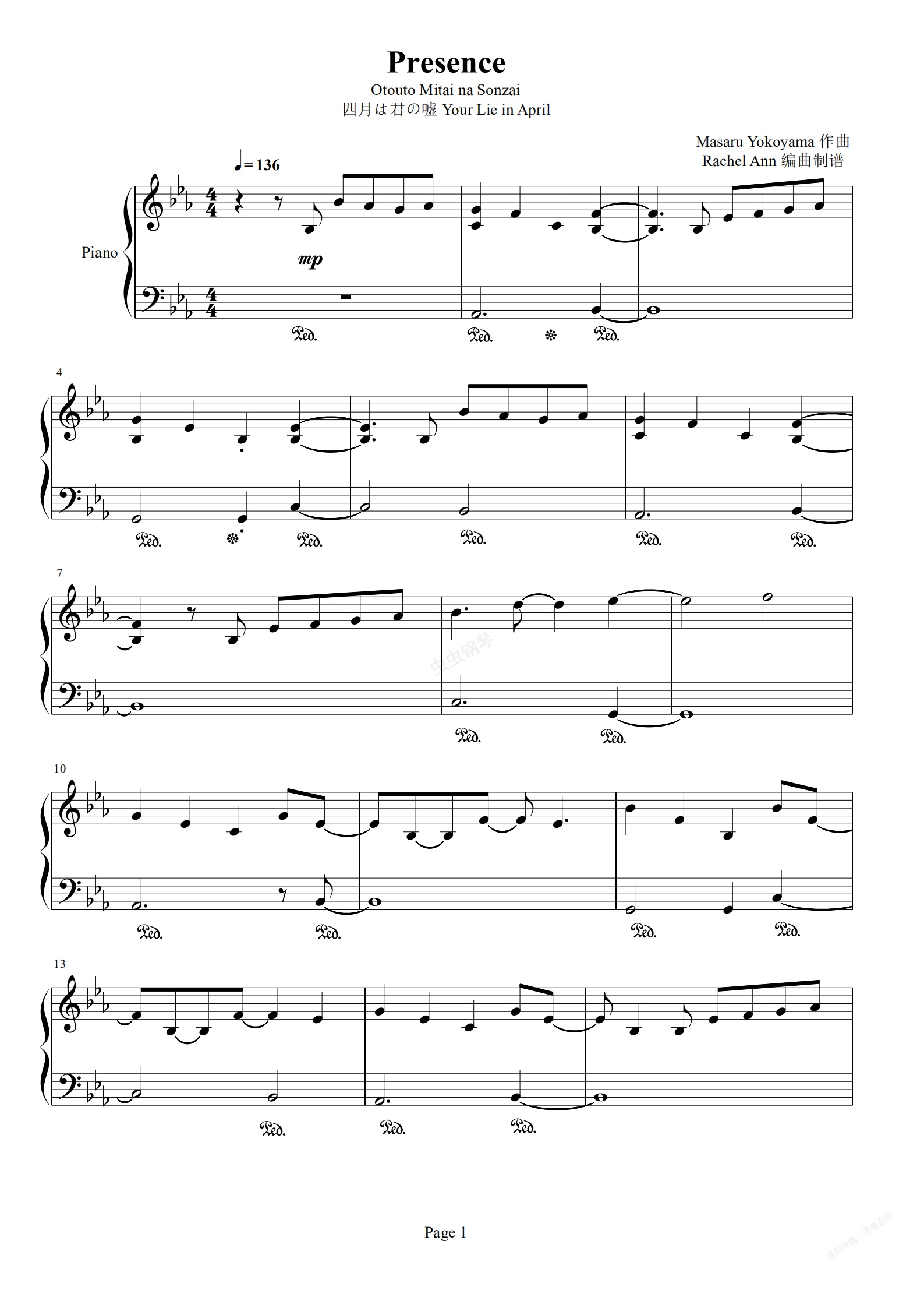 钢琴谱:Presence四月是你的谎言Otouto Mitai na Sonzai-Your Lie in April OST