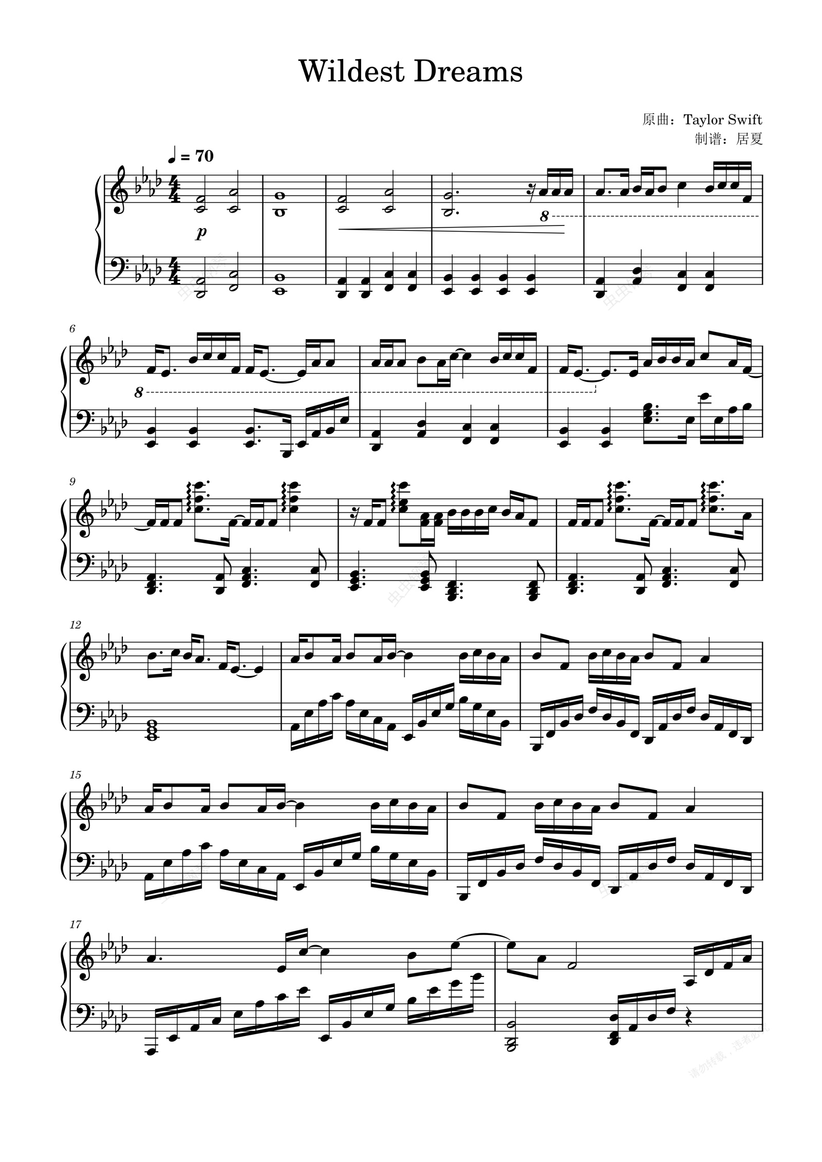 钢琴谱:Wildest Dreams 独奏版Taylor's Version