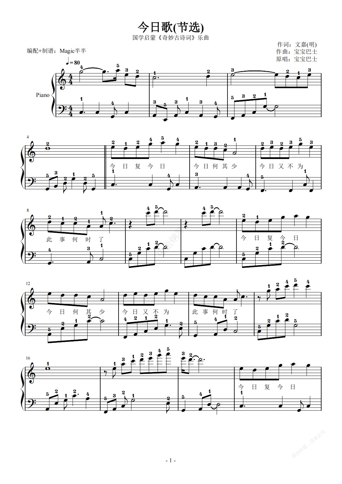 钢琴谱:奇妙古诗词/今日歌(节选)(带指法)
