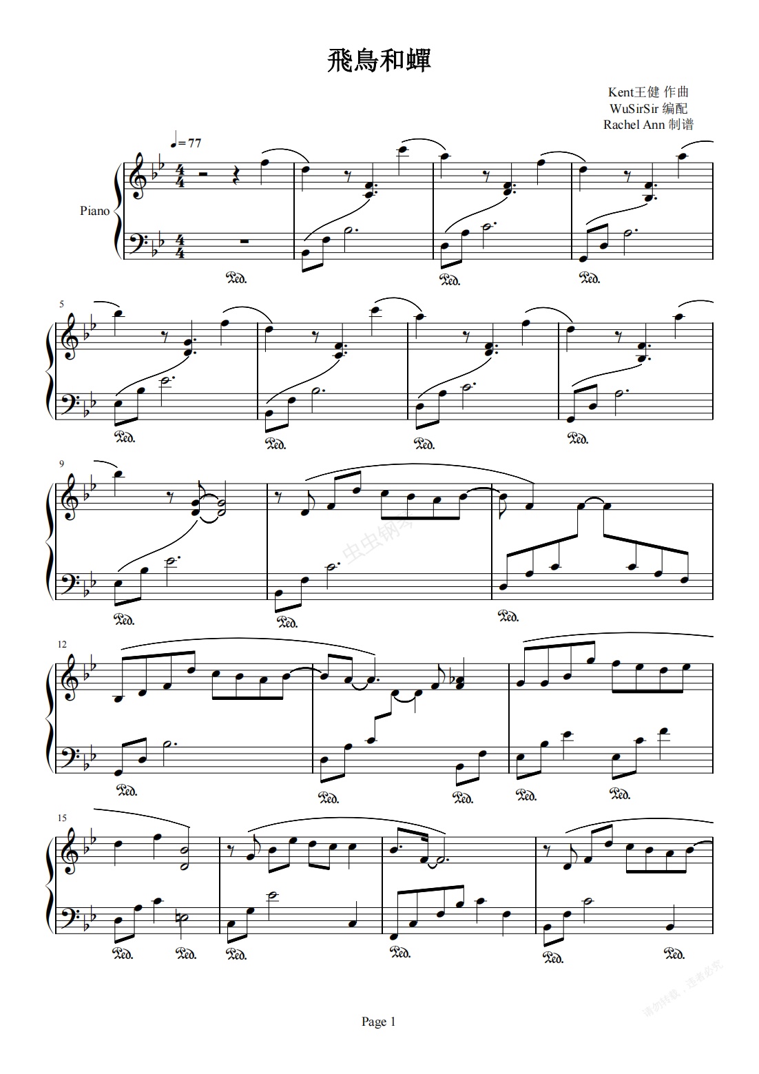 钢琴谱:飞鸟和蝉-任然 原调独奏钢琴版 编配超好听