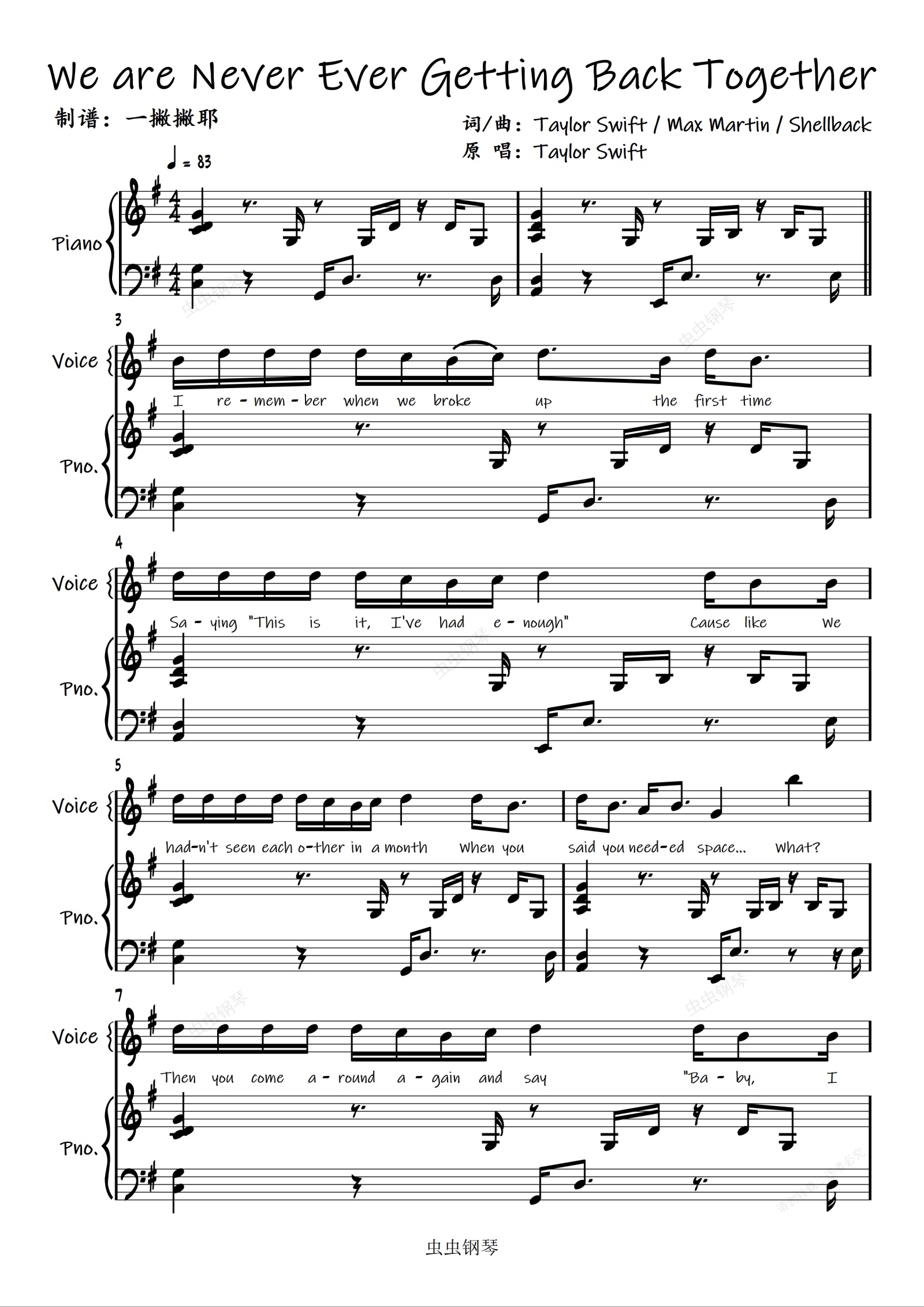 钢琴谱:【弹唱谱】We are Never Ever Ever Getting Back Together-Taylor Swift 泰勒·斯威夫特「一撇撇耶」