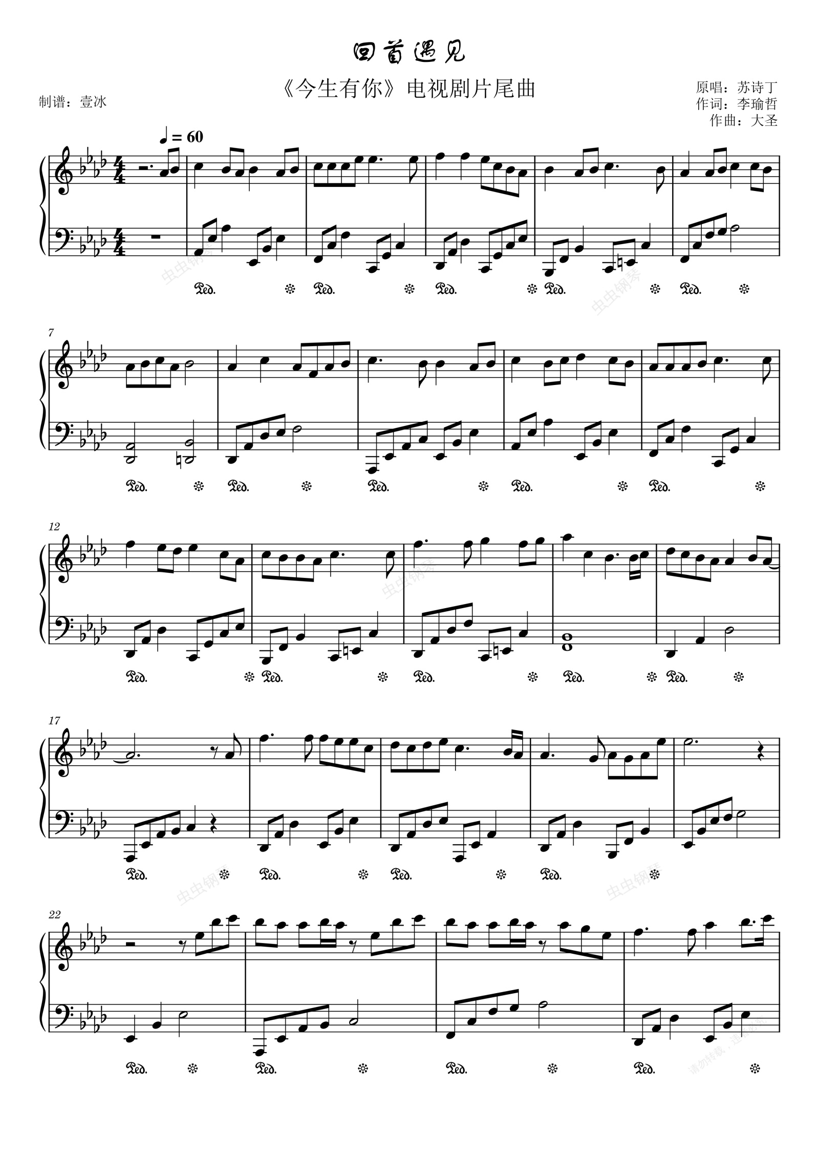 钢琴谱:回首遇见//《今生有你》电视剧片尾曲-原调