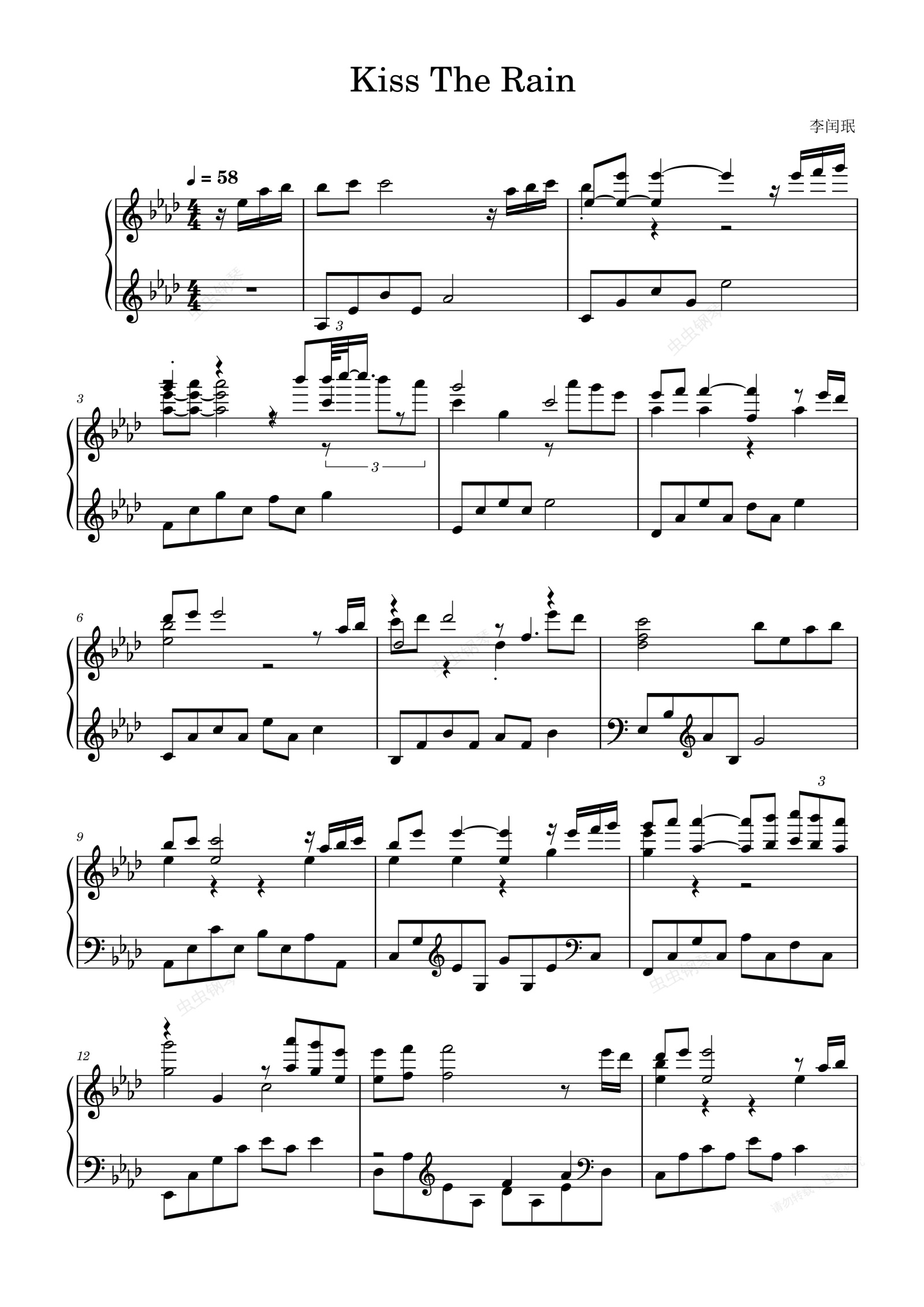 钢琴谱:Kiss The Rain(雨的印记)钢琴独奏降A大调