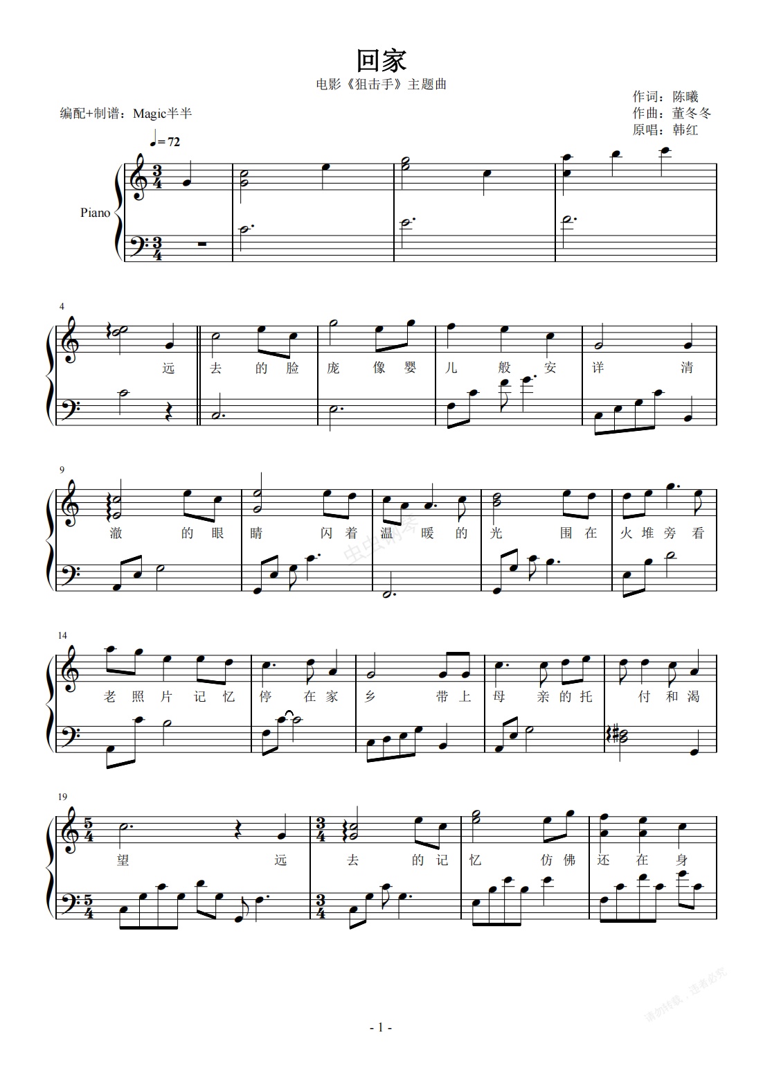 钢琴谱:回家(C调) 电影<狙击手>主题曲