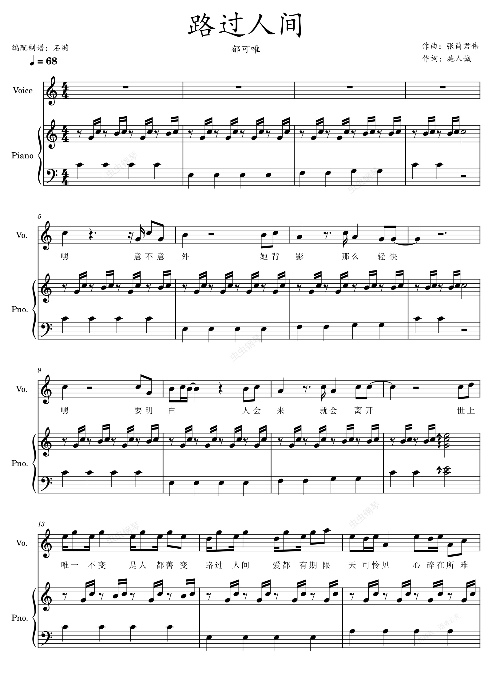 钢琴谱:路过人间 C大调弹唱谱 【石漪编配】