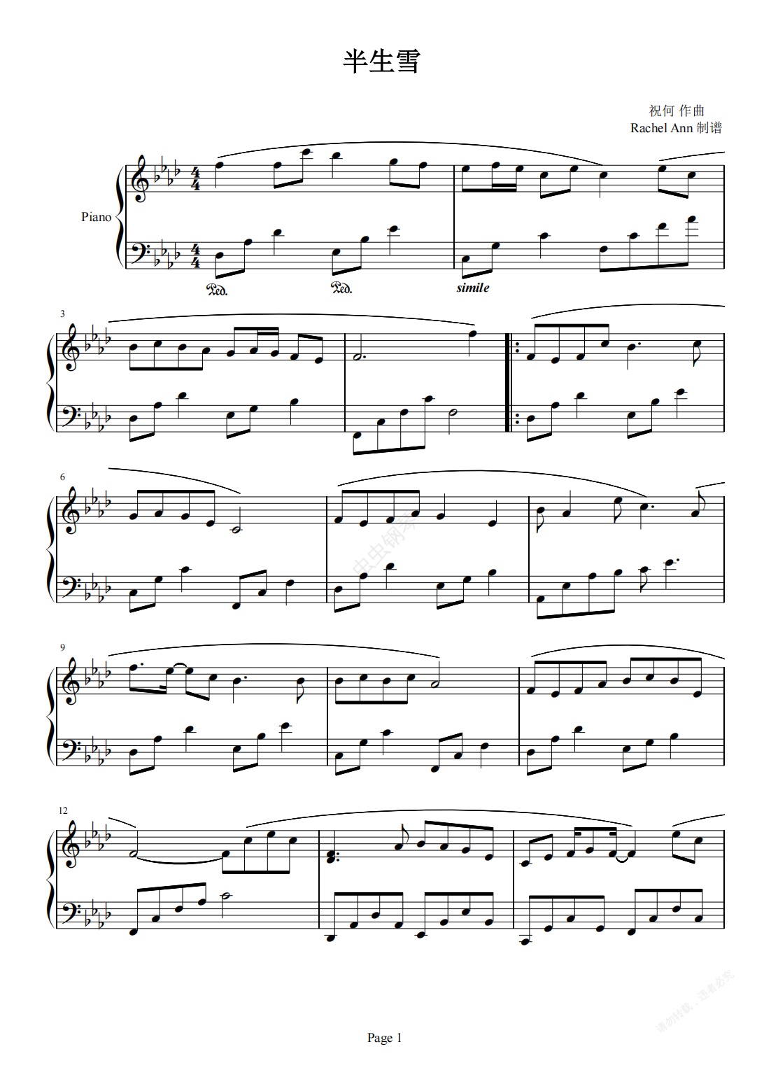 钢琴谱:半生雪-是七叔呢 原调钢琴独奏 简易简单版