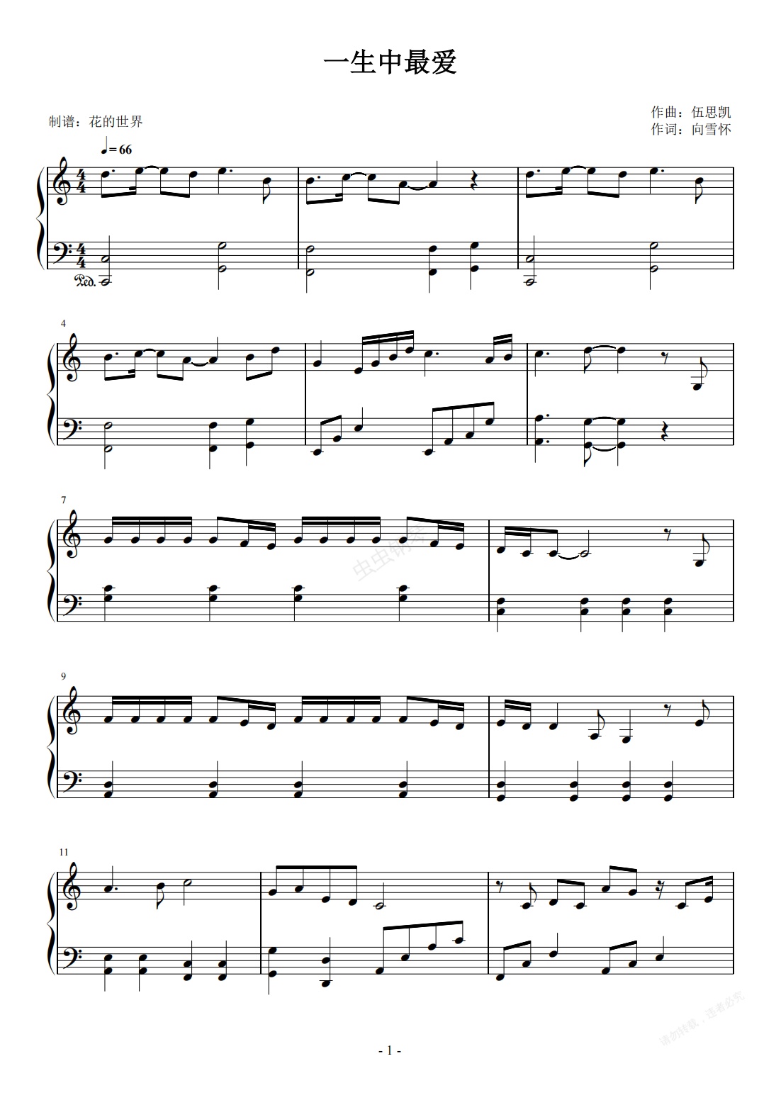 钢琴谱:一生中最爱 C调简易版 谭咏麟