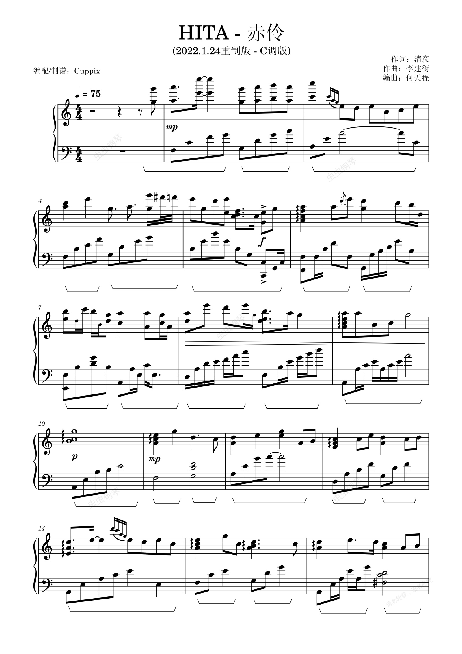 钢琴谱:HITA《赤伶》Cuppix编配-唯美高度还原-C调(2022.1.24重置版)