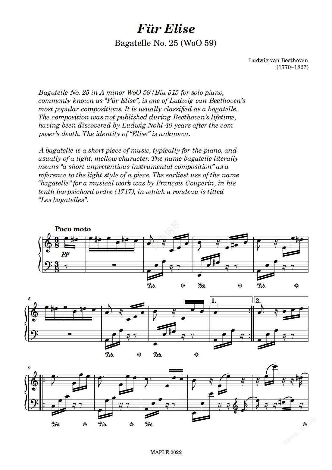 No. 25 in A minor WoO 59/Bia 515 for solo piano, known as “Für Elise”, is one of van’s