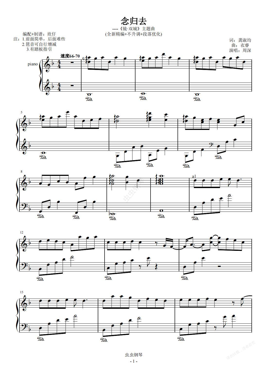 钢琴谱:周深-F《念归去》(全新精编+不升调+段落优化、《镜·双城》主题曲)