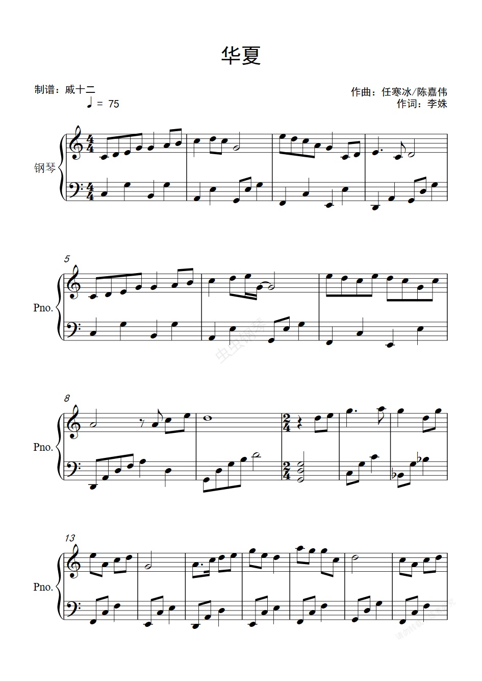 钢琴谱:华夏-C调简单版