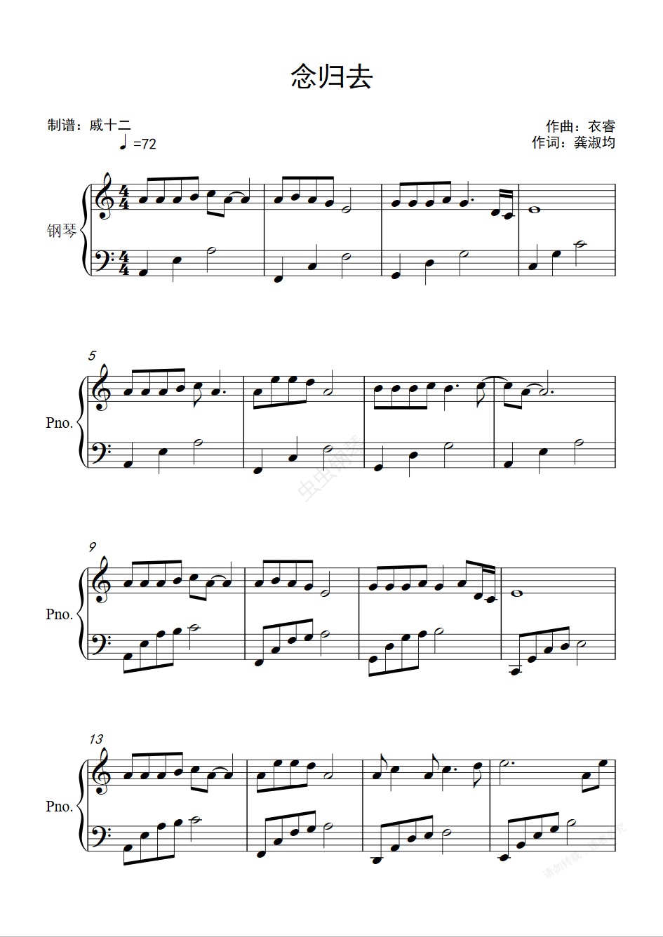 钢琴谱:念归去-C调简单版-镜双城主题曲