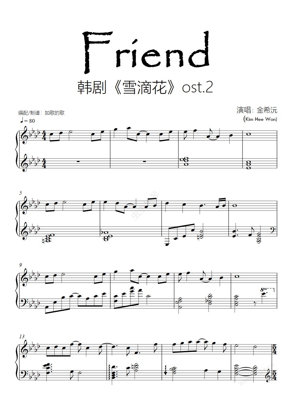 钢琴谱:Friend韩剧《雪滴花》ost.2可弹可唱