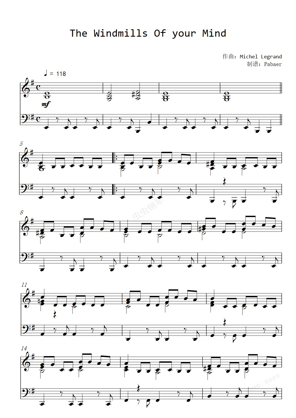 钢琴谱:The Windmills Of your Mind(你心中的风车Les Moulins De Mon Coeur)