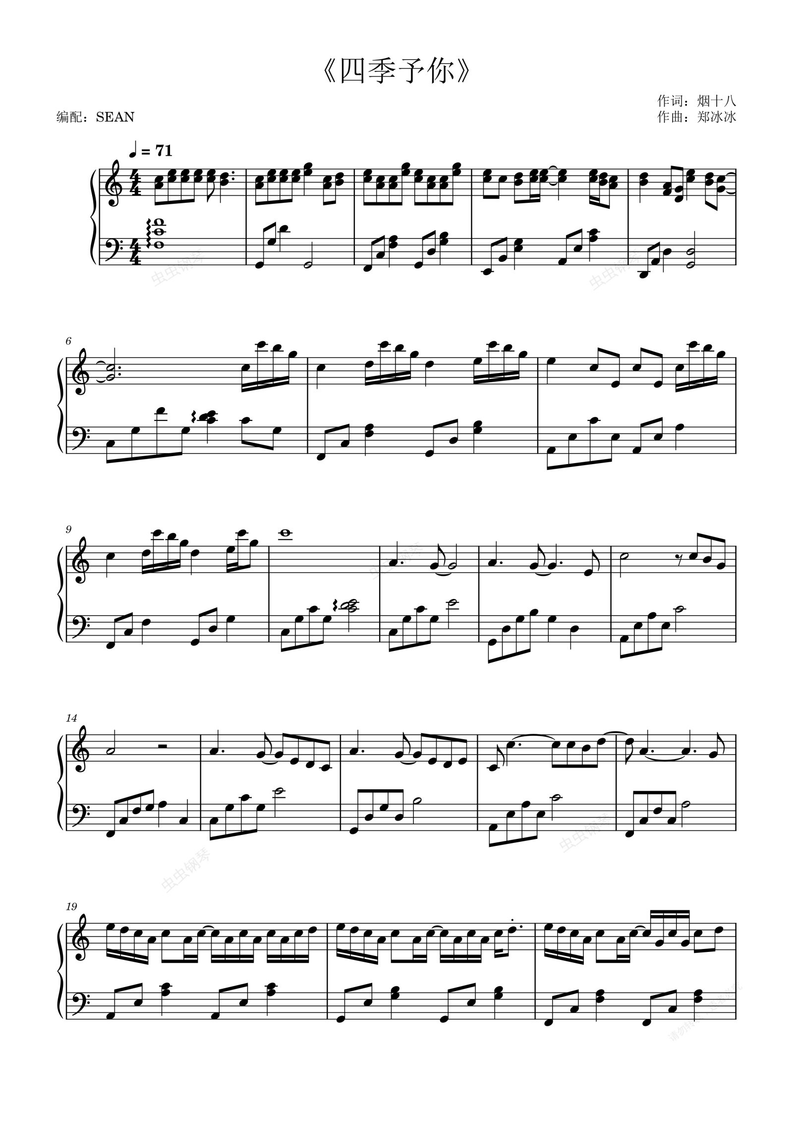 钢琴谱:《四季予你》程响-C调 『 SEAN 编配 』唯美版