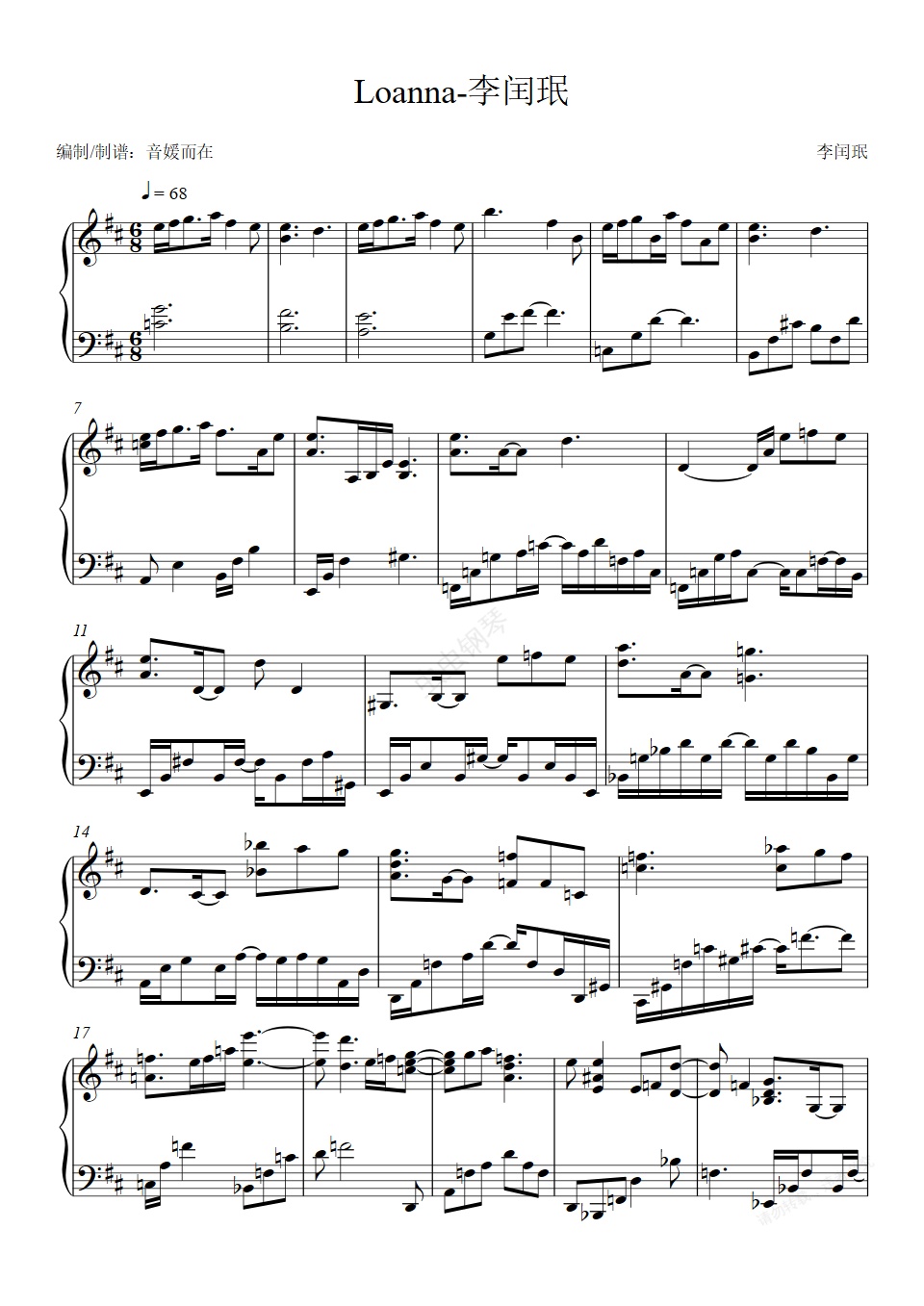 钢琴谱:钢琴|李闰珉《Loanna》Yiruma 免费谱