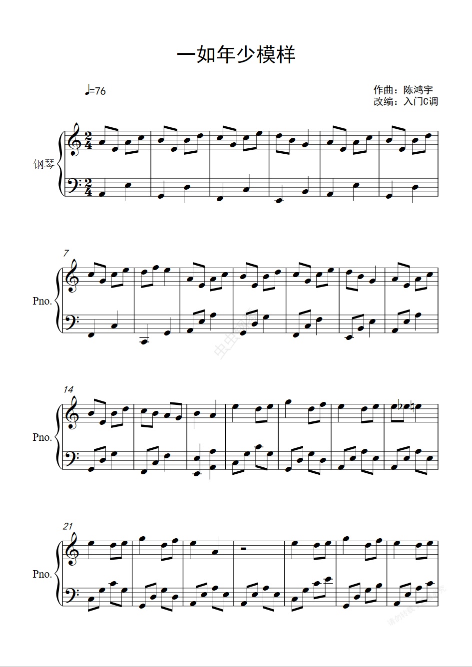 钢琴谱:陈冬霖《一如年少模样》入门C调简单版