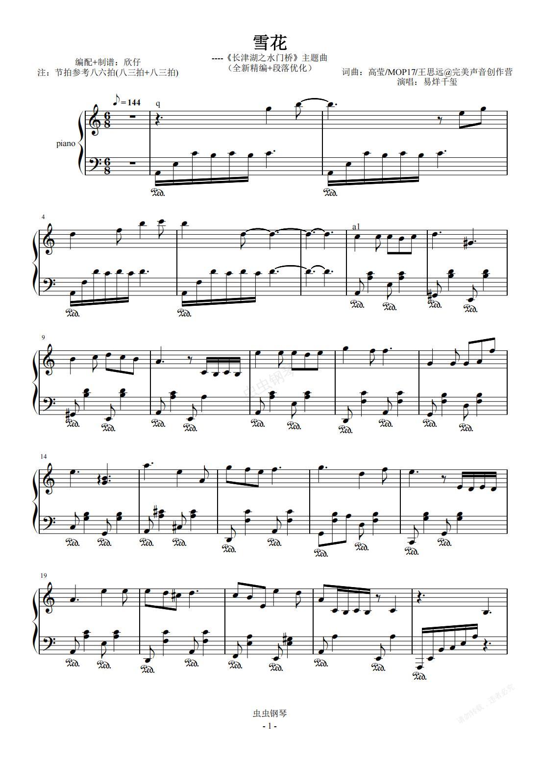 钢琴谱:易烊千玺-C《雪花》(《长津湖之水门桥》主题曲、全新精编+段落优化)