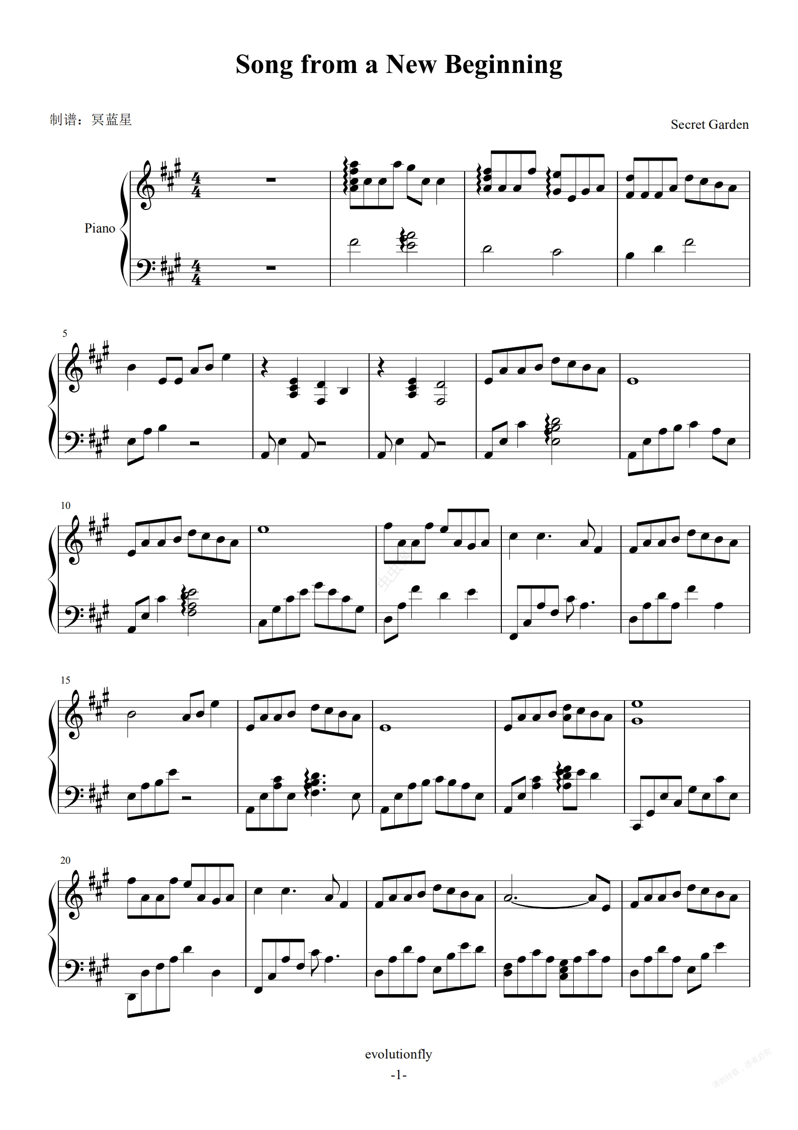 钢琴谱:a New Beginning-Secret Garden 演奏谱