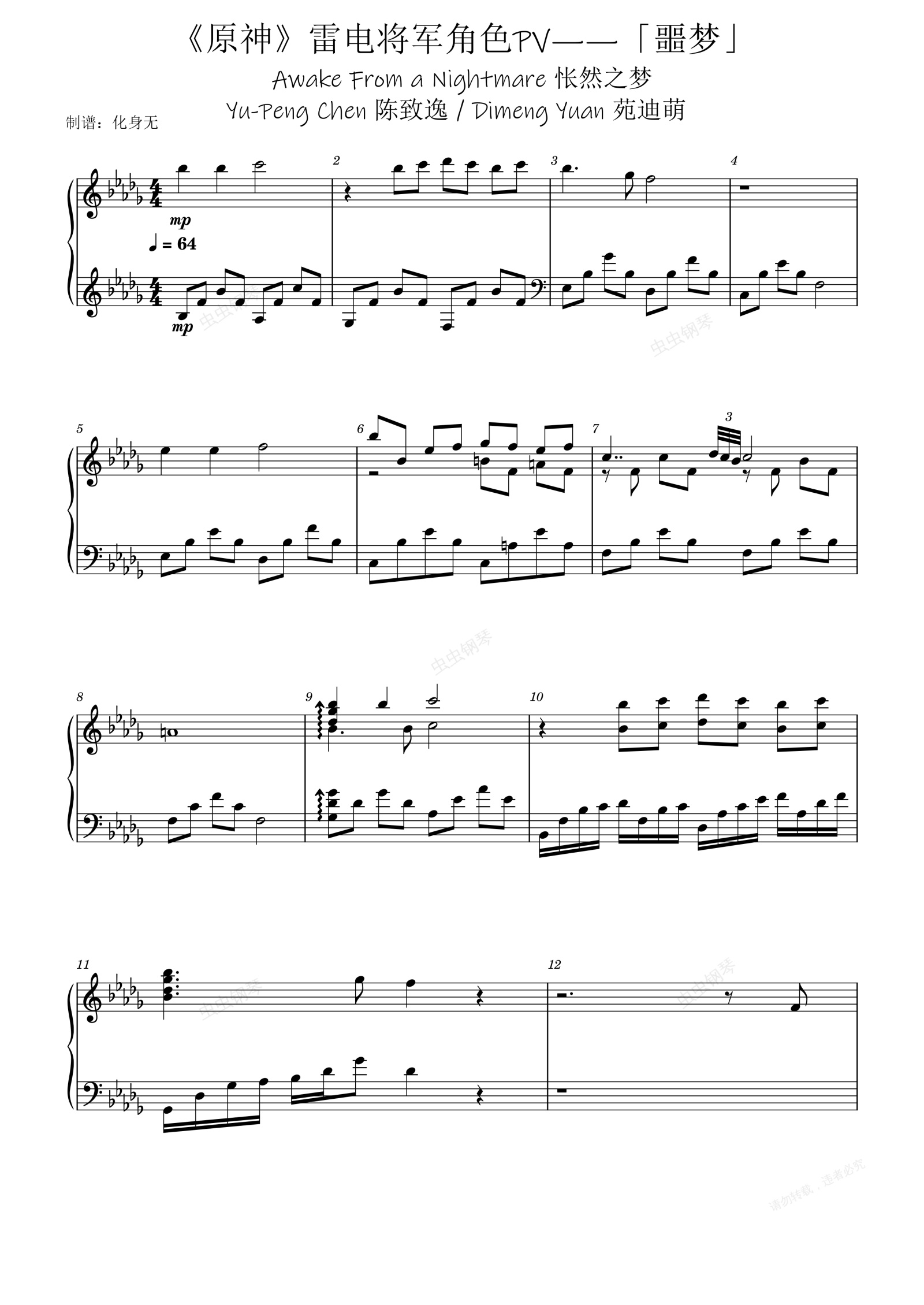 钢琴谱:噩梦 原神雷电将军角色PV 怅然之梦 Awake From a Nightmare