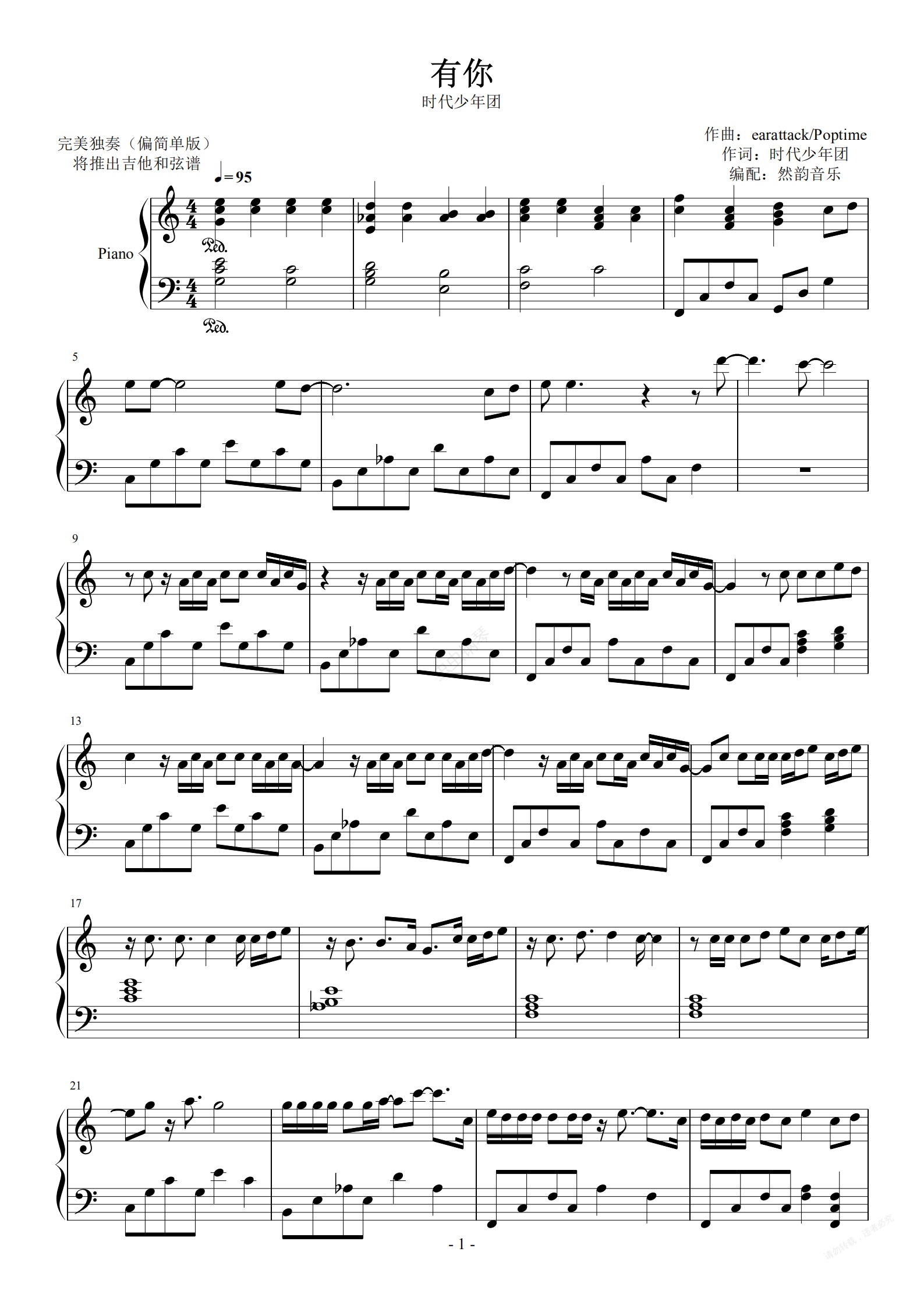 钢琴谱:【C调】有你-TNT时代少年团 独奏偏简单版【然韵音乐编配】