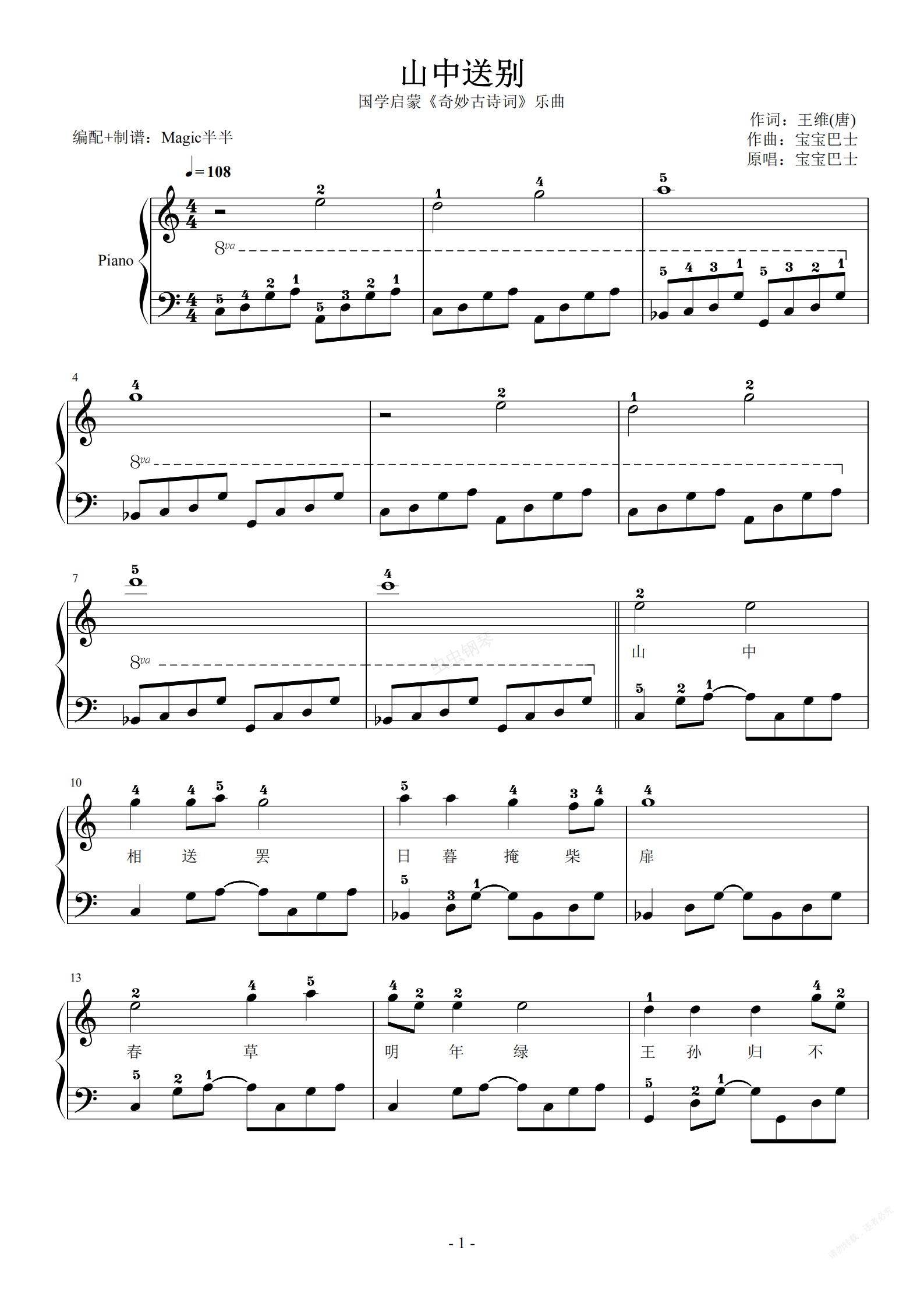 钢琴谱:奇妙古诗词/山中送别(带指法)