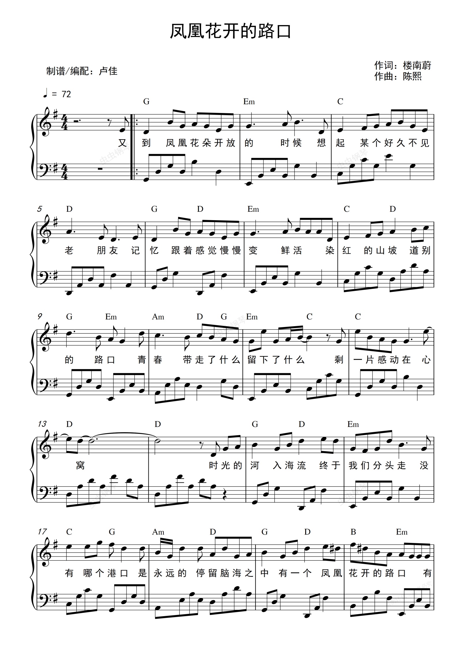 钢琴谱:凤凰花开的路口