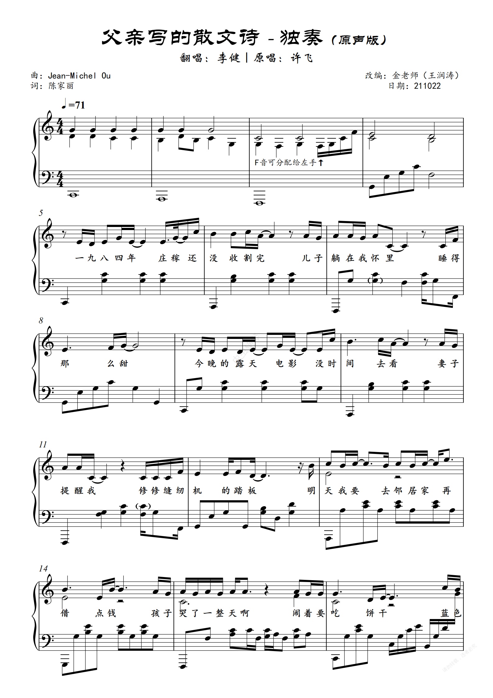 钢琴谱:父亲写的散文诗-金老师钢琴独奏谱