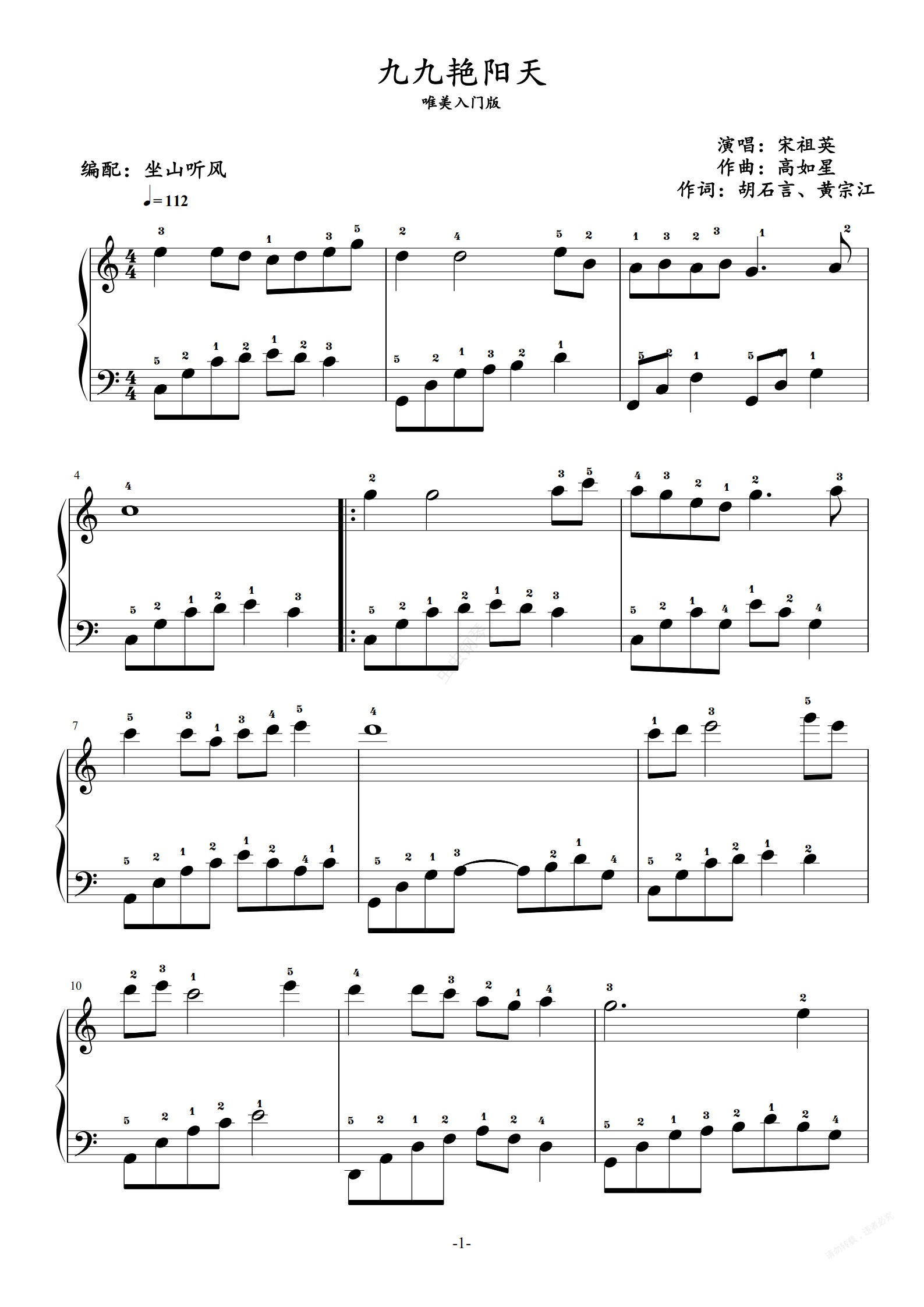 钢琴谱:九九艳阳天——唯美入门版(大音符)