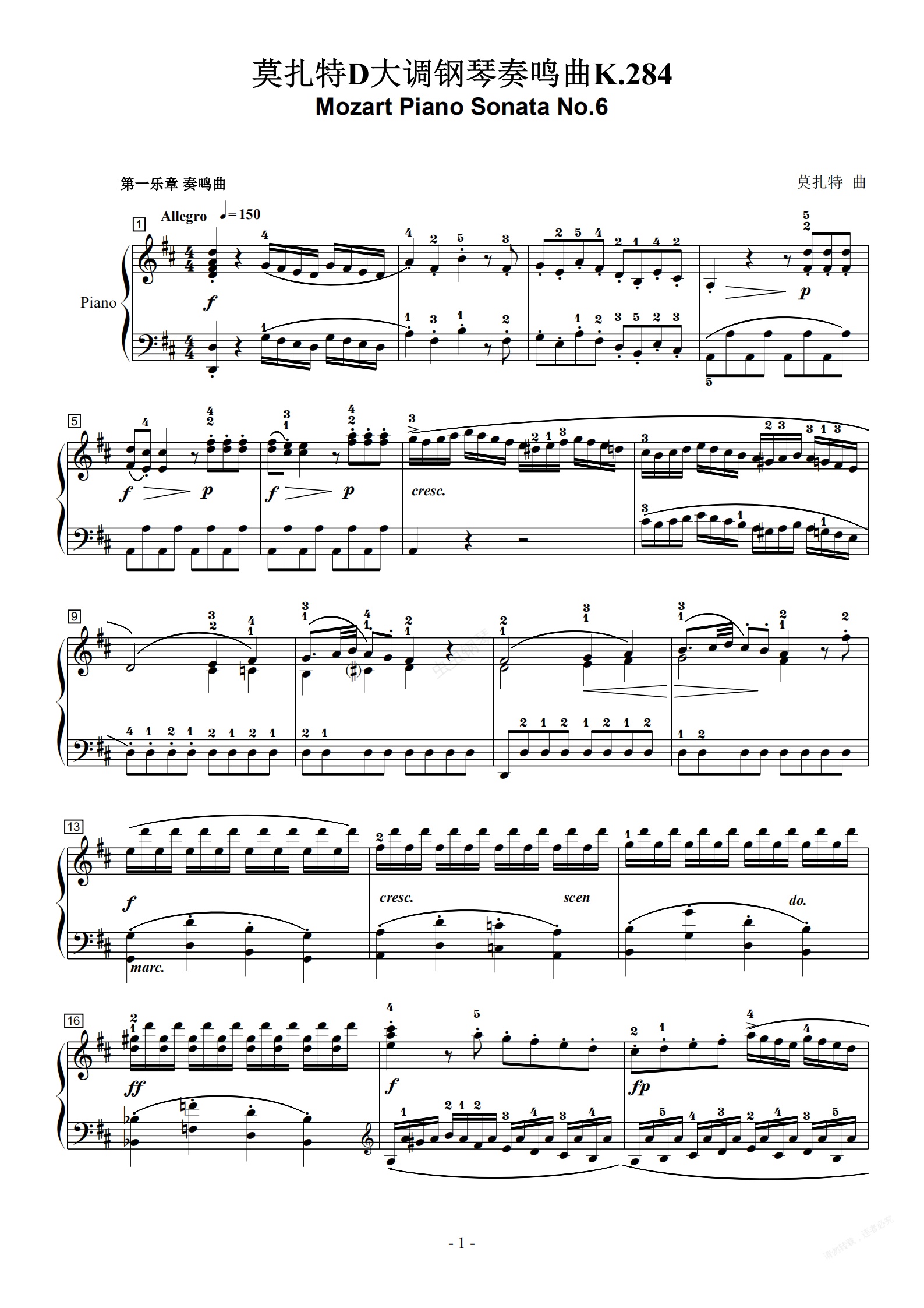 钢琴谱:莫扎特D大调钢琴奏鸣曲k284