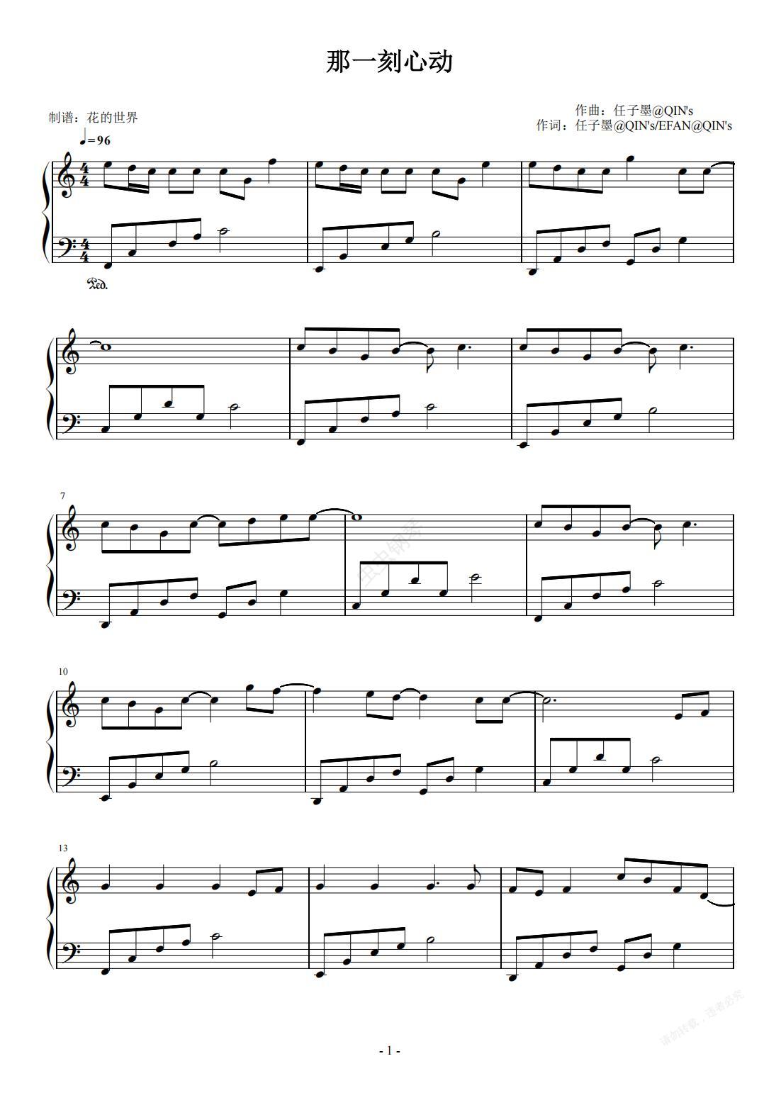钢琴谱:那一刻心动 C调简易版本 任子墨