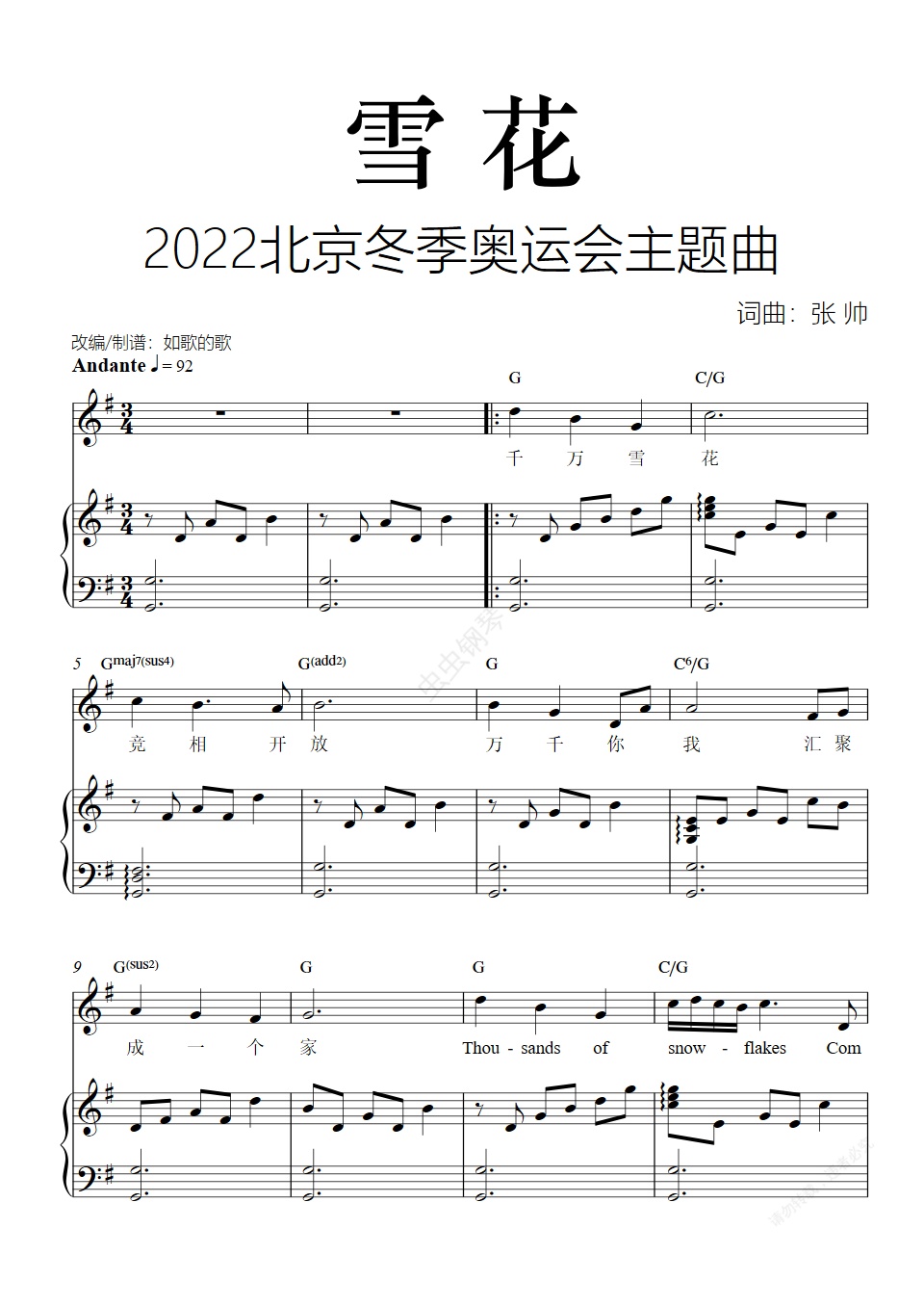 钢琴谱:雪花-2022冬奥主题曲旋律+钢伴可弹唱