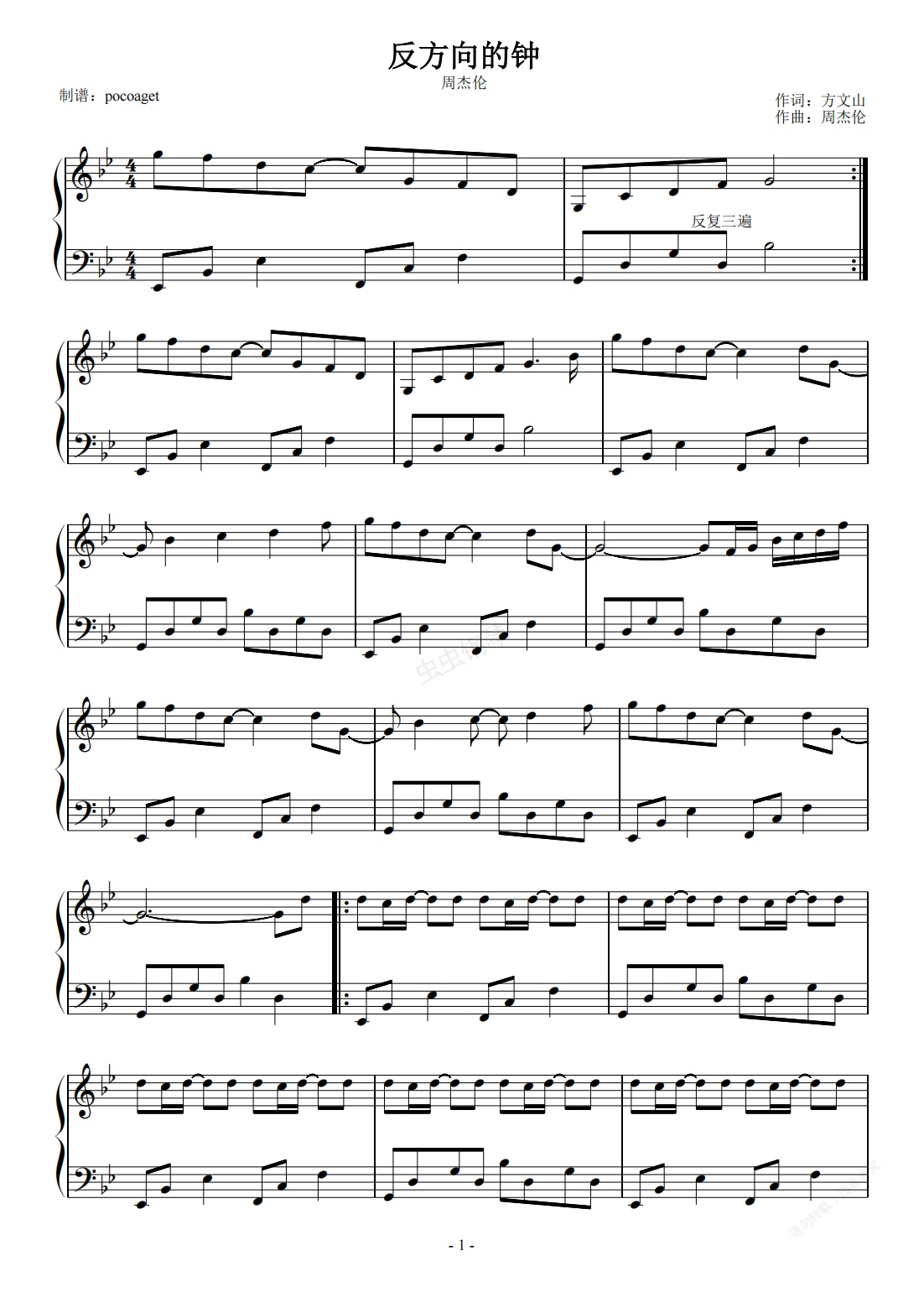 钢琴谱:反方向的钟 周杰伦(初学者原调版)