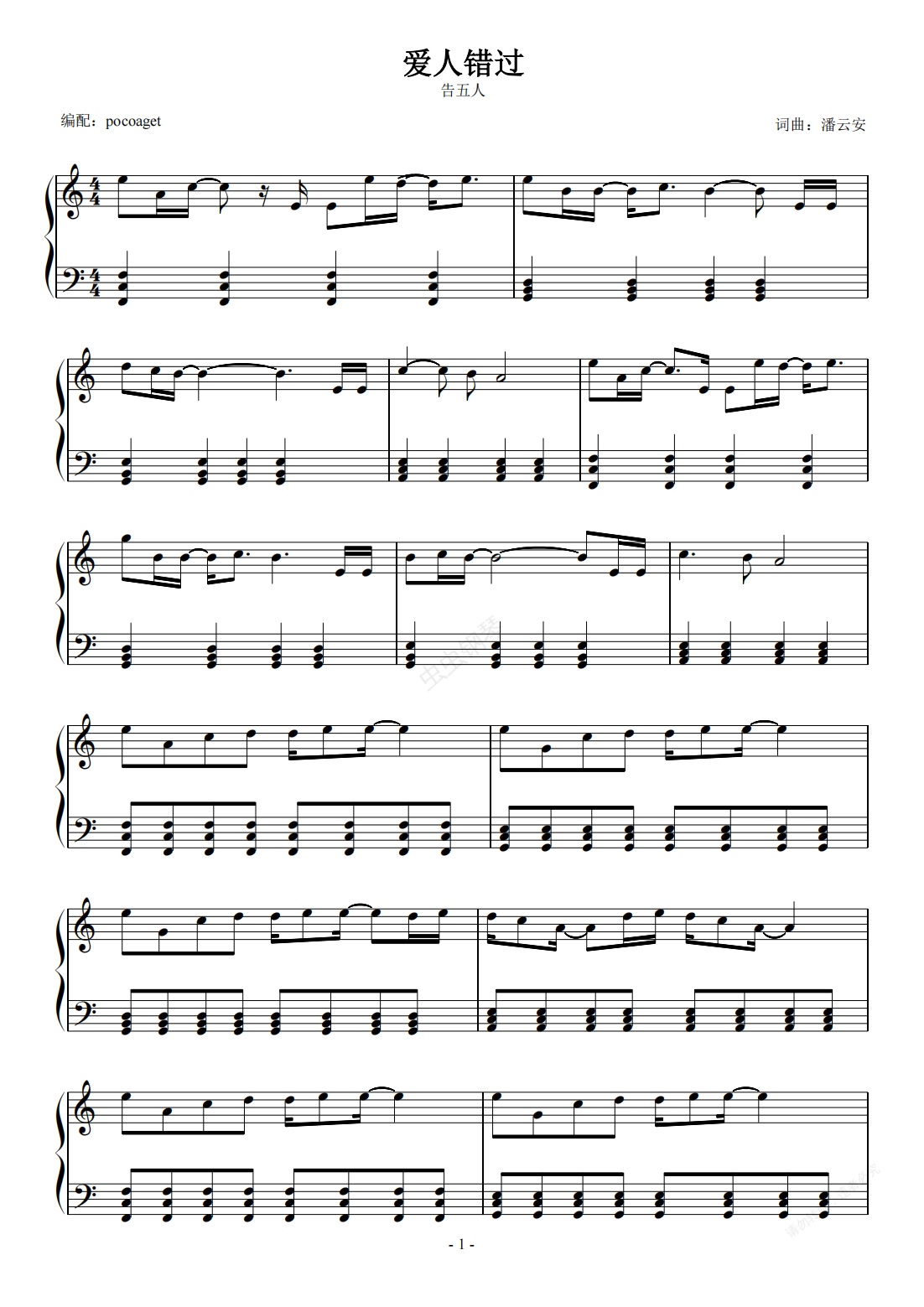 钢琴谱:《爱人错过》告五人,好上手初学者C调版