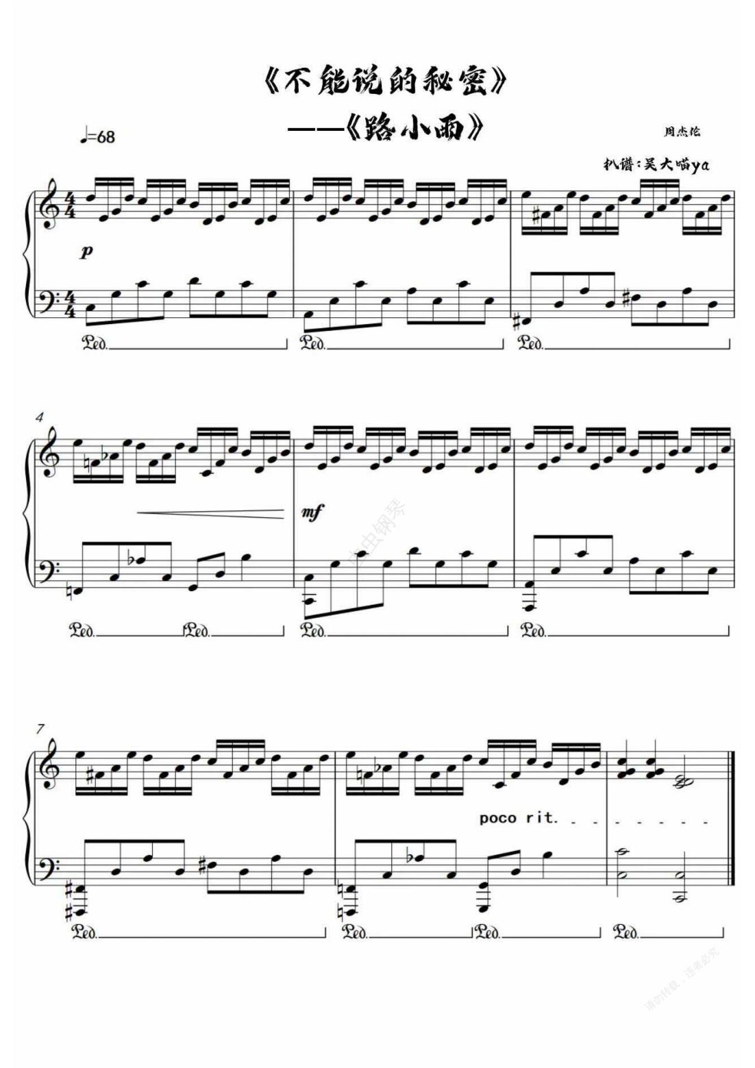 钢琴谱:《路小雨》—周杰伦 C大调