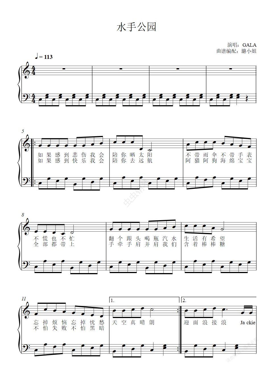 钢琴谱:水手公园 - C调简单版 - 附歌词