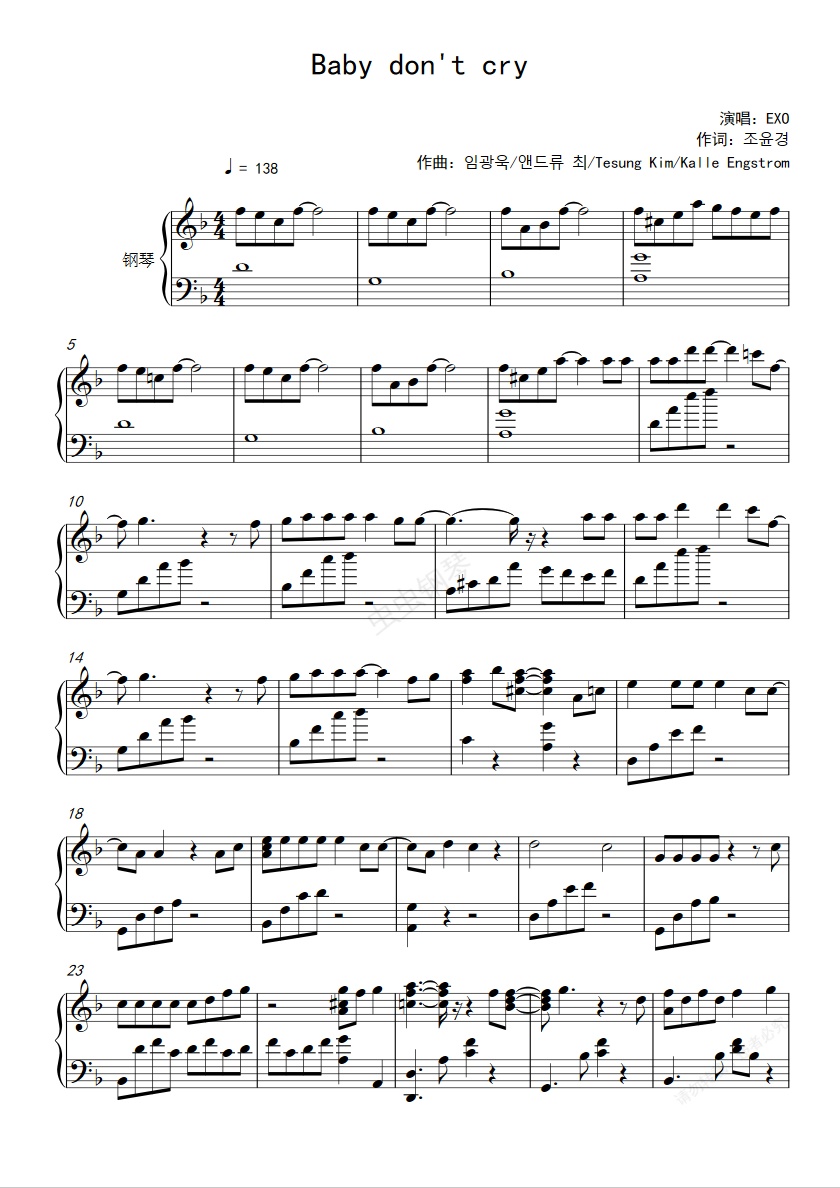 钢琴谱:Baby Don't Cry-EXO (人鱼的眼泪)超好听