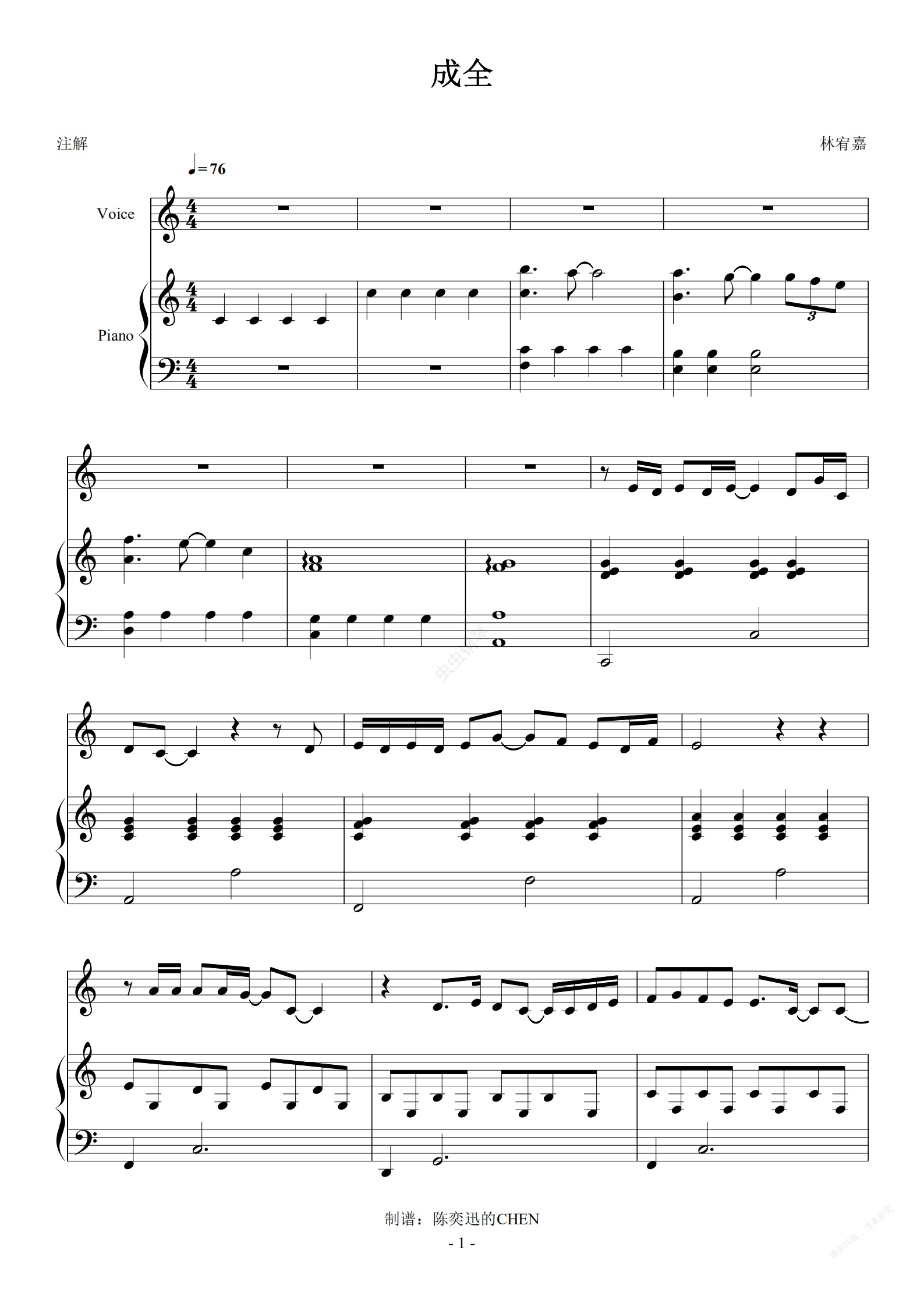 钢琴谱:成全C调完美弹唱谱