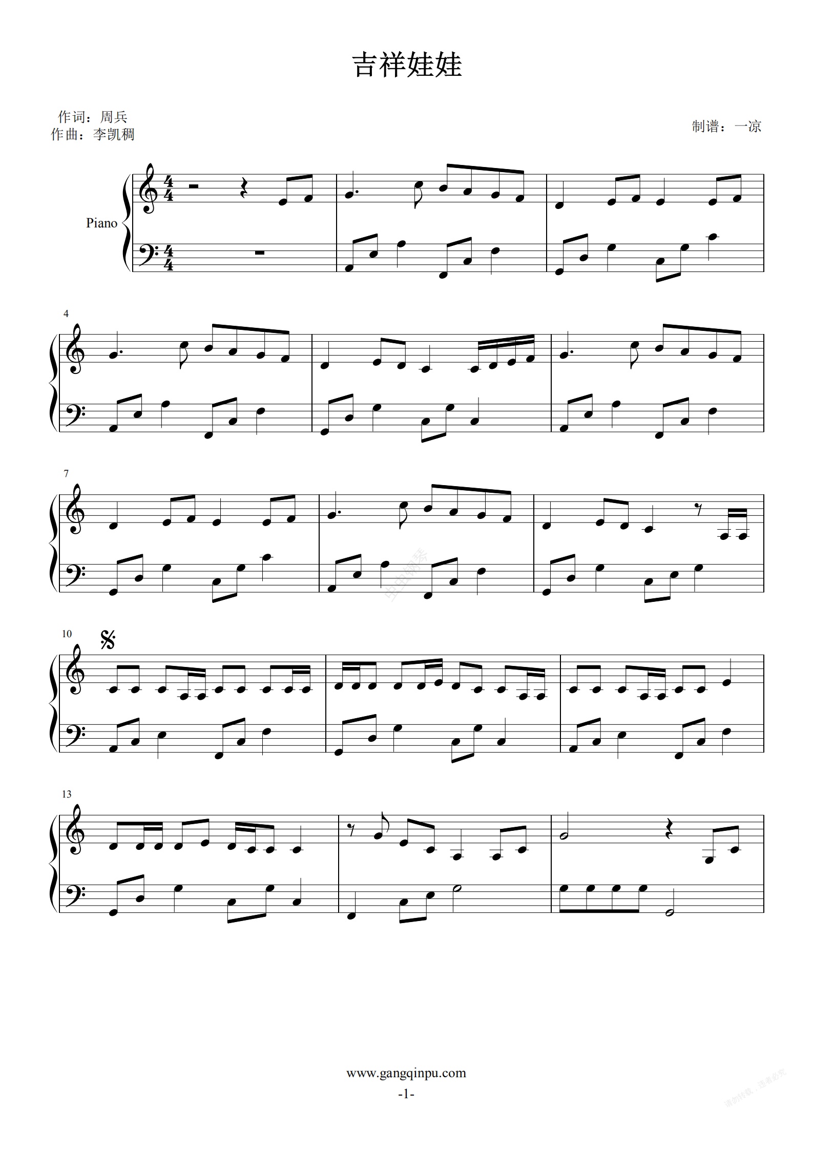 钢琴谱:吉祥娃娃 潮流儿歌 C调好听版