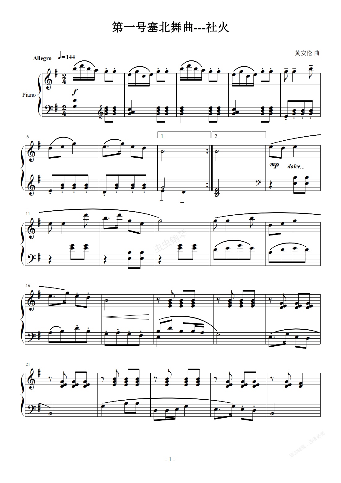 钢琴谱:《第一号塞北舞曲--灶火》川音五级