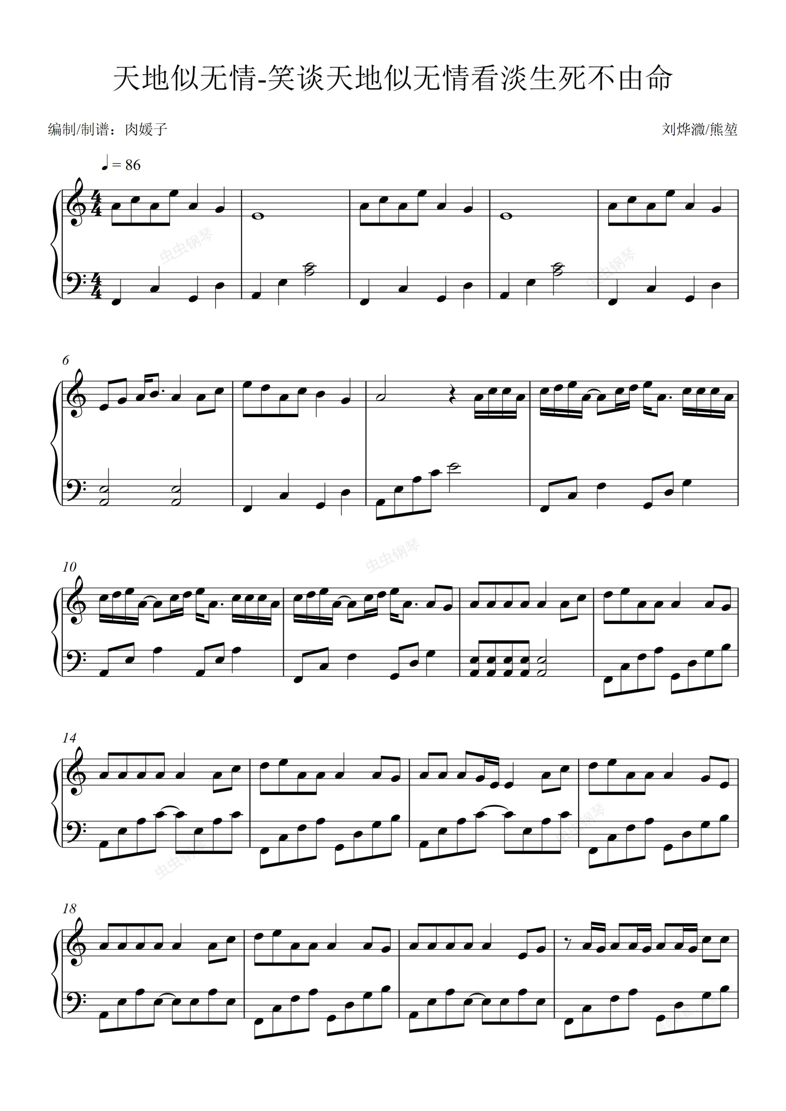 钢琴谱:天地似无情-笑谈天地似无情看淡生死不由命【好听简单版】