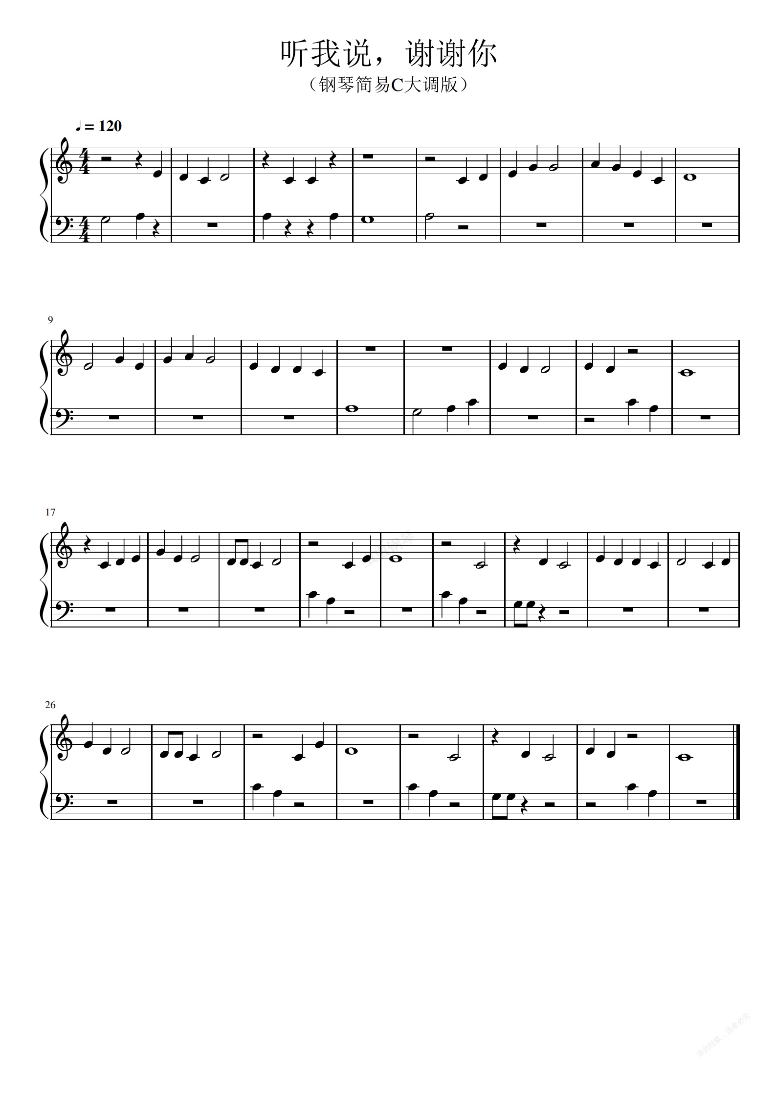 钢琴谱:《听我说,谢谢你》极简单版
