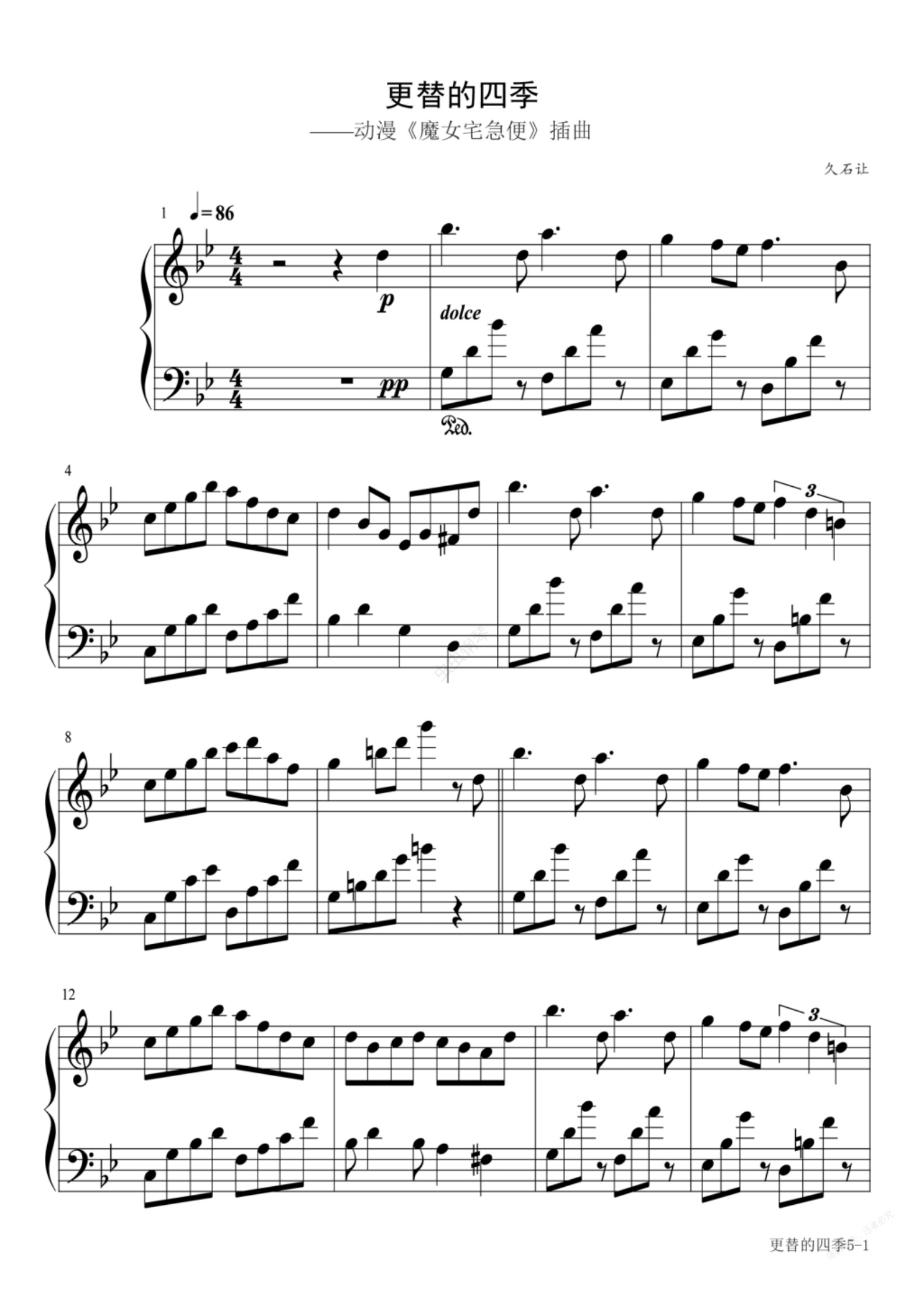 钢琴谱:更替的四季《魔女宅急便》插曲