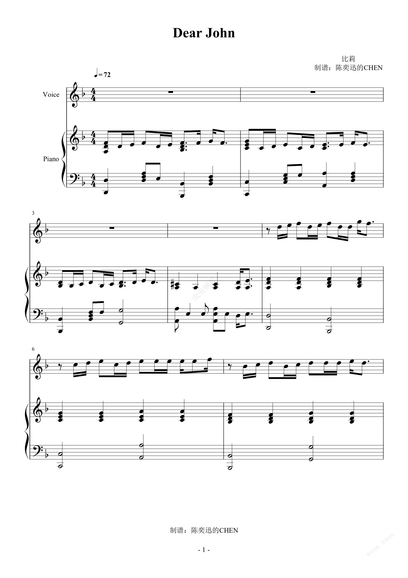 钢琴谱:Dear John 原调完美弹唱谱