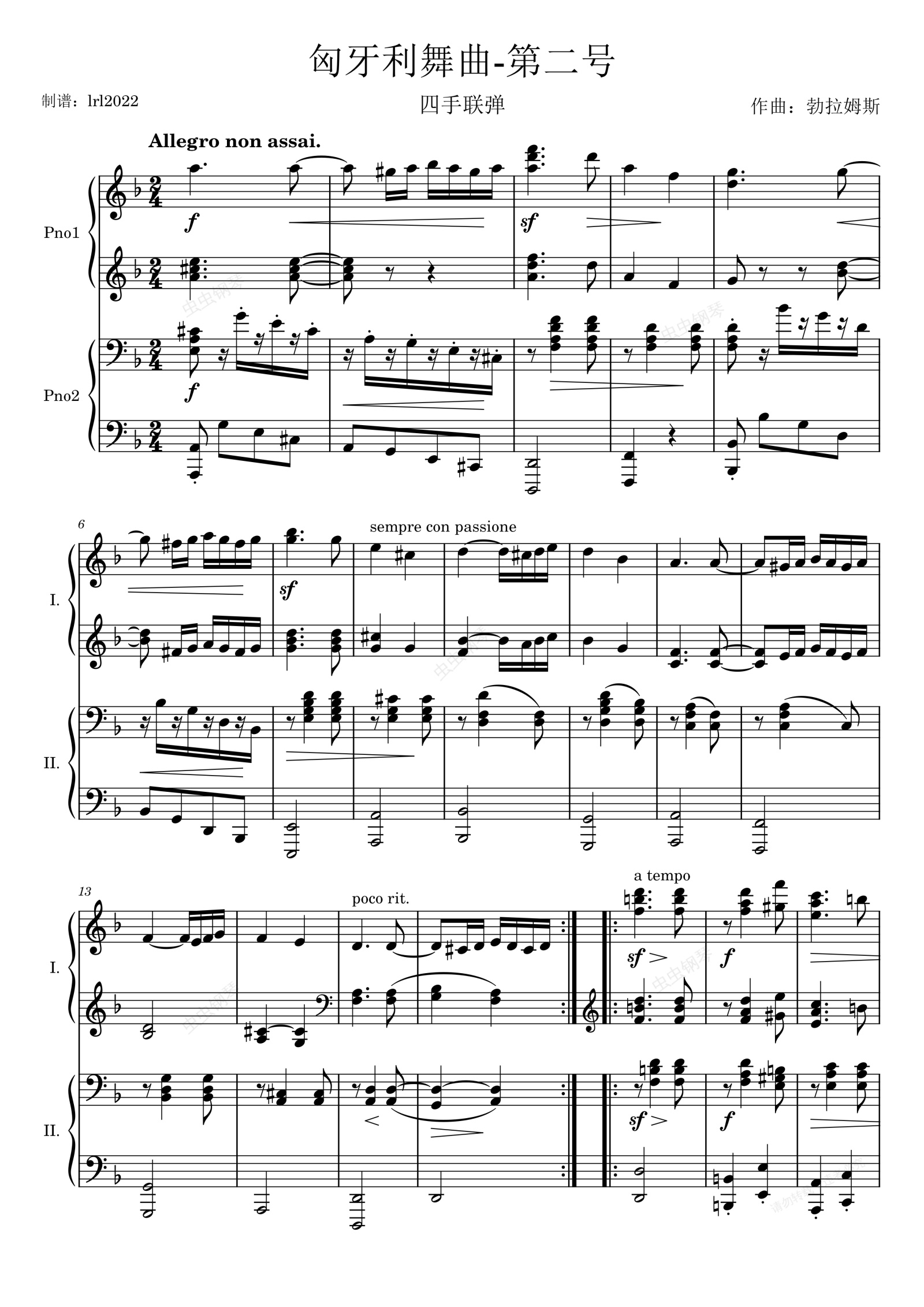 钢琴谱:匈牙利舞曲-第二号-四手联弹-勃拉姆斯-2号-钢琴谱-WoO 1-No.2